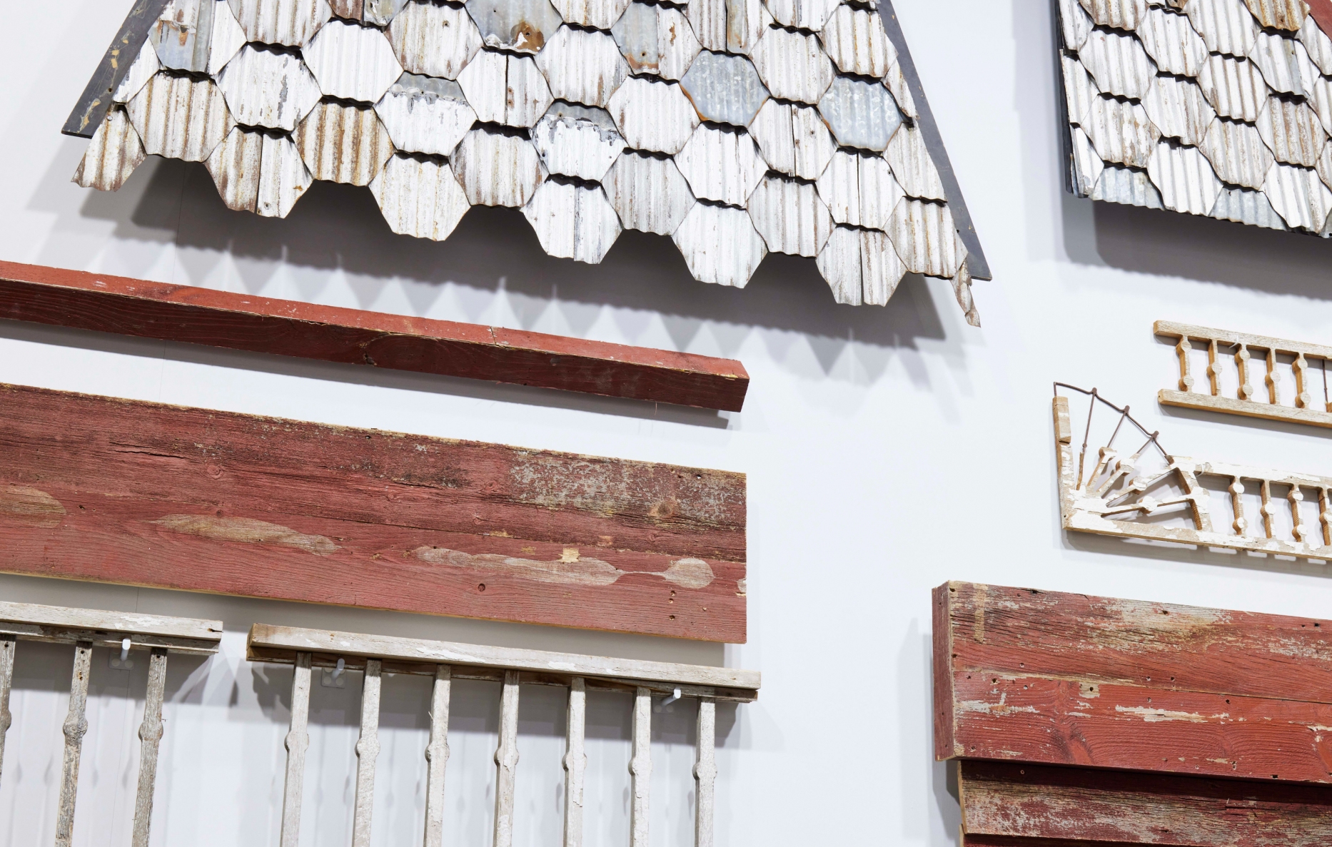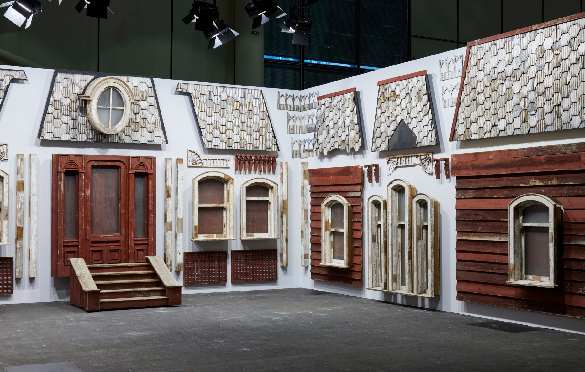 PsychoBarn (Cut Up) de Cornelia Parker a été créée à partir d'éléments sélectionnés d'une œuvre antérieure, Transitional Object (PsychoBarn), de 2016, qui avait été commandée par le Metropolitan Museum de New York. Il s'agissait d'un fac-similé du célèbre manoir du film Psycho d'Hitchcock de 1960, construit à partir de pièces d'une vieille grange rouge américaine archétypale. La nouvelle installation déconstruit ce bâtiment sous la forme d'une vue éclatée. Les fenêtres, les portes, les panneaux et le toit en tôle ondulée ont été altérés par les saisons passées des deux côtés de l'Atlantique. Les panneaux sont présentés formellement comme un salon suspendu, semblant planer sur la surface de trois murs, certains occupant le sol. Le toit en bardeaux, les fenêtres, le porche et les escaliers sont réorganisés à l'aide de la technique dadaïste du cut-up pour créer une nouvelle composition, une sorte de soulèvement de grange à l'envers.