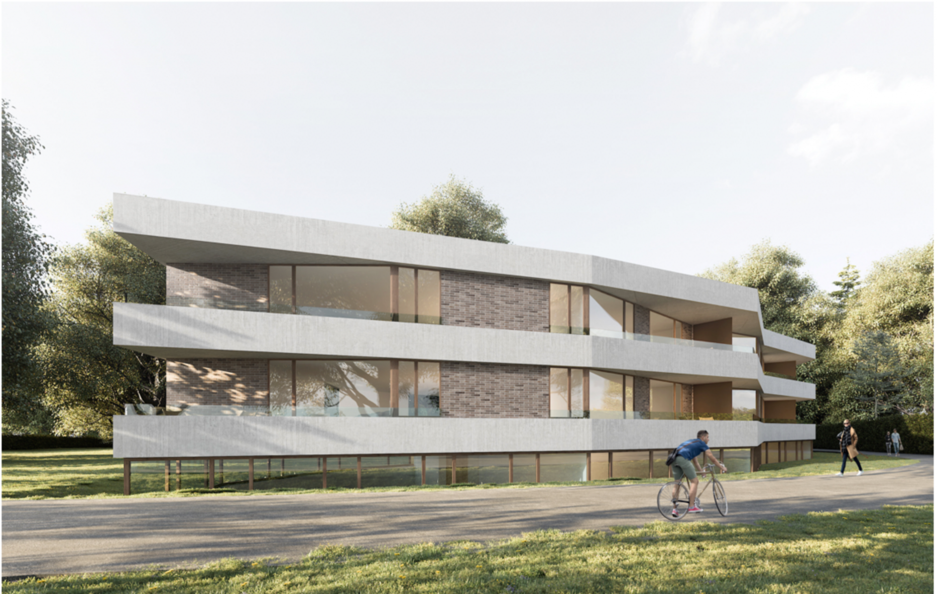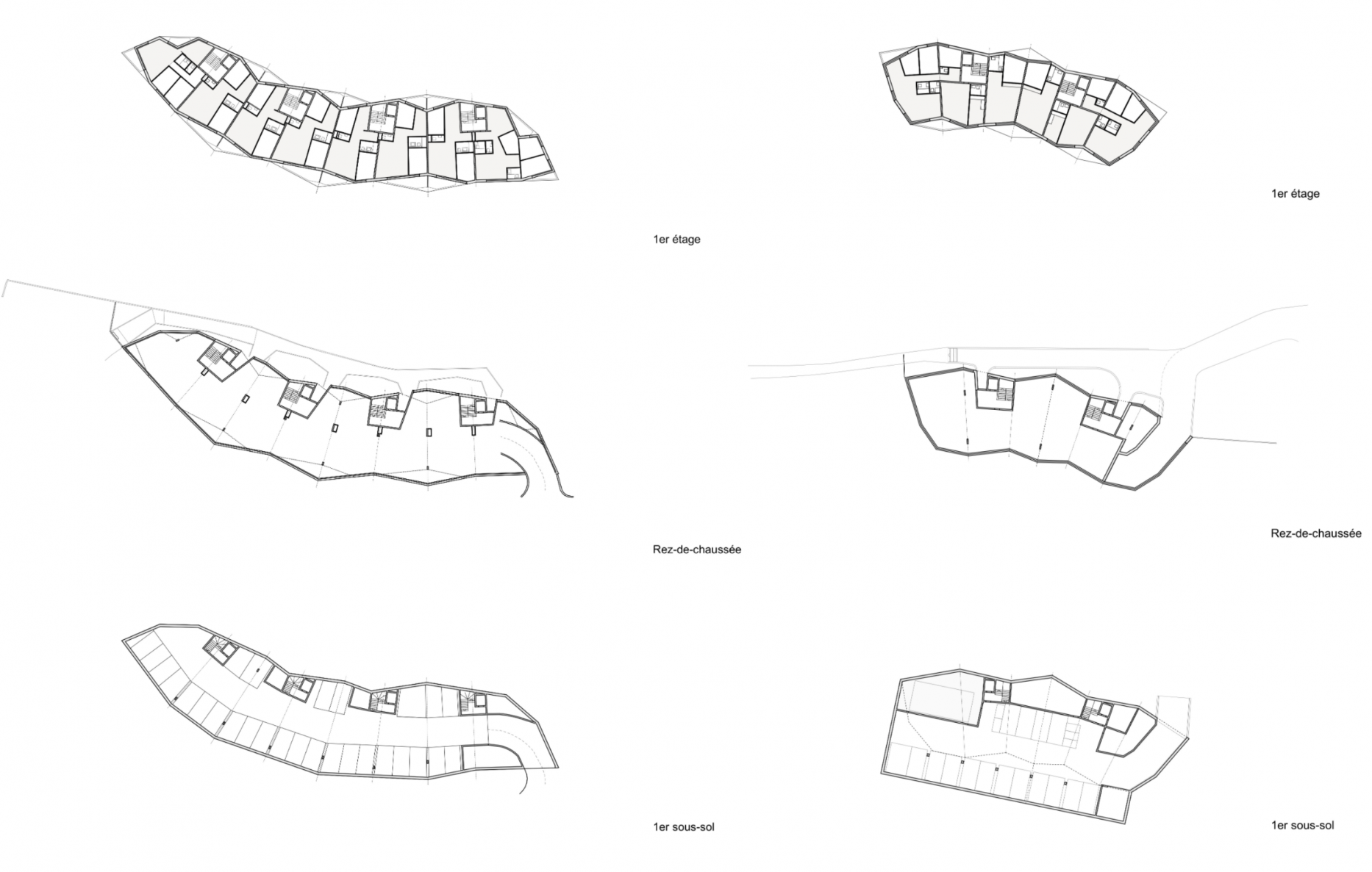 Les périmètres d’implantation retenus, il convient de déterminer la question des gabarits et de la volumétrie, ainsi que celle des accès. Bien que très éloignés l’un de l’autre, les deux bâtiments adoptent un vocabulaire identique où la contemporanéité formelle compose avec une gamme chromatique tout en retenue et une matérialité aux accents traditionnels (présence minérale, brique). Les volumes pourtant de belle taille évitent de montrer la totalité de leurs façades grâce à un jeu habile de facettes fragmentées. La combinaison prismatique faussement aléatoire, avec angles saillants et rentrants, élude ainsi toute monotonie et offre d’agréables loggias ouvertes sur le paysage, parfaitement cadrées dans le volume bâti. Au-dessus d’un rez-de-chaussée à demi enterré destiné à des activités créatives ou de bureaux, deux étages accueillent des logements fluides, avec une typologie essentiellement traversante pour l’immeuble du haut, et une organisation plus classique pour celui situé en bas de parcelle (chambres au Nord, pièces à vivre au Sud). Sous chaque bâtiment, profitant de la déclivité du terrain, un sous-sol très contenu intègre l’ensemble du stationnement, sans rampe béante et sans engager la possibilité de plantations en pleine terre alentour. La proximité avec le domaine public favorise enfin une accessibilité aisée aux différents halls d’entrée.