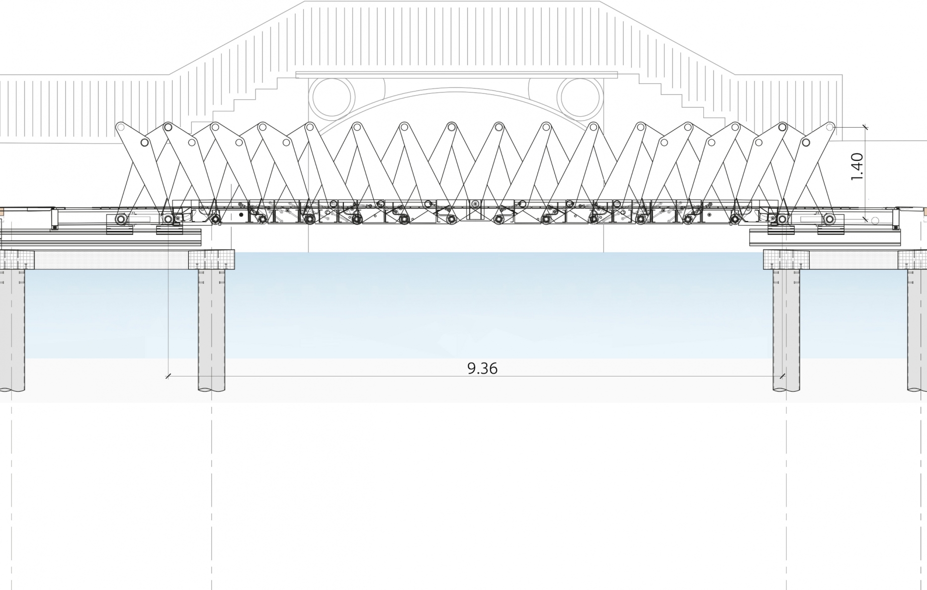Les reflexions ont abouti à un concept unique et novateur, assurant la continuité de l’esplanade tant dans sa position horizontale que dans celle qui laisse passer les bateaux: pour laisser passer les embarcations, le ponton plat se soulève, sans aucune interruption matérielle, en un doux mouvement sinusoïdal.