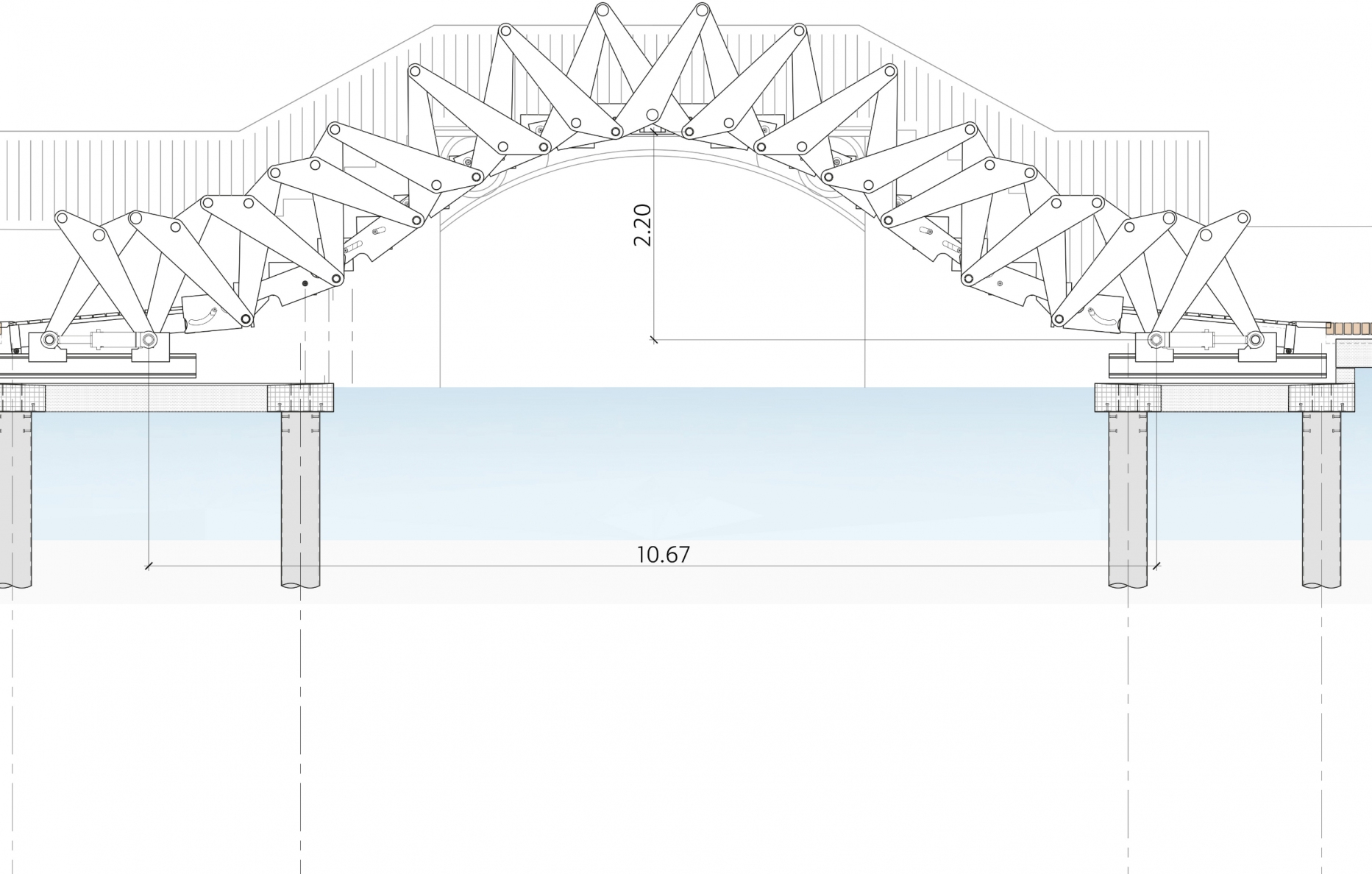 Une fois le concept défini restait la question de la réalisation d’une structure porteuse plate capable de se transformer en une structure courbe, sans oublier le développement d’un système à la fois simple, fiable et durable à l’usage. La passerelle se compose de deux ensembles de ciseaux métalliques positionnés de part et d’autre d’un tablier lui aussi conçu comme un mécanisme capable de suivre le mouvement du pont imprimé par des pistons: un ingénieux système de bielles et de limons transforme les caissons du tablier en une succession de marches.