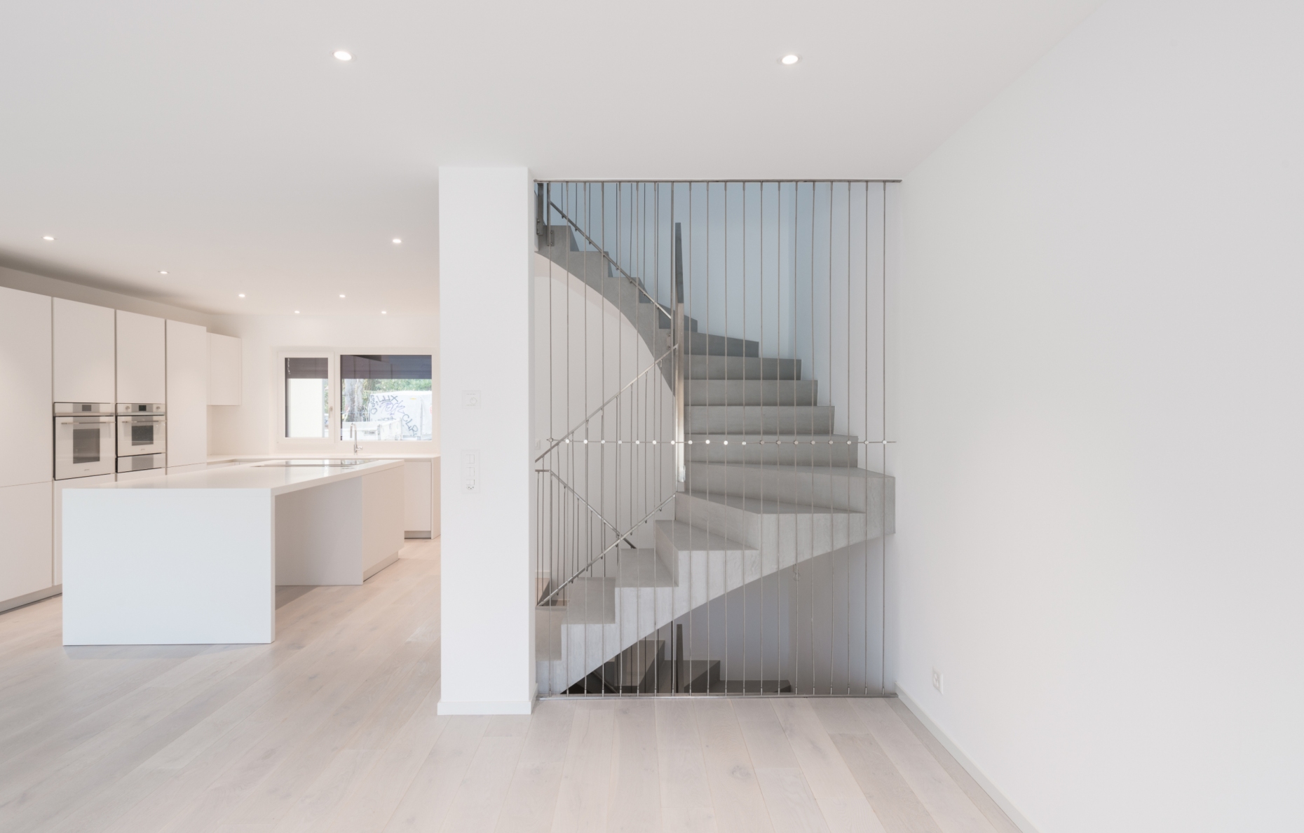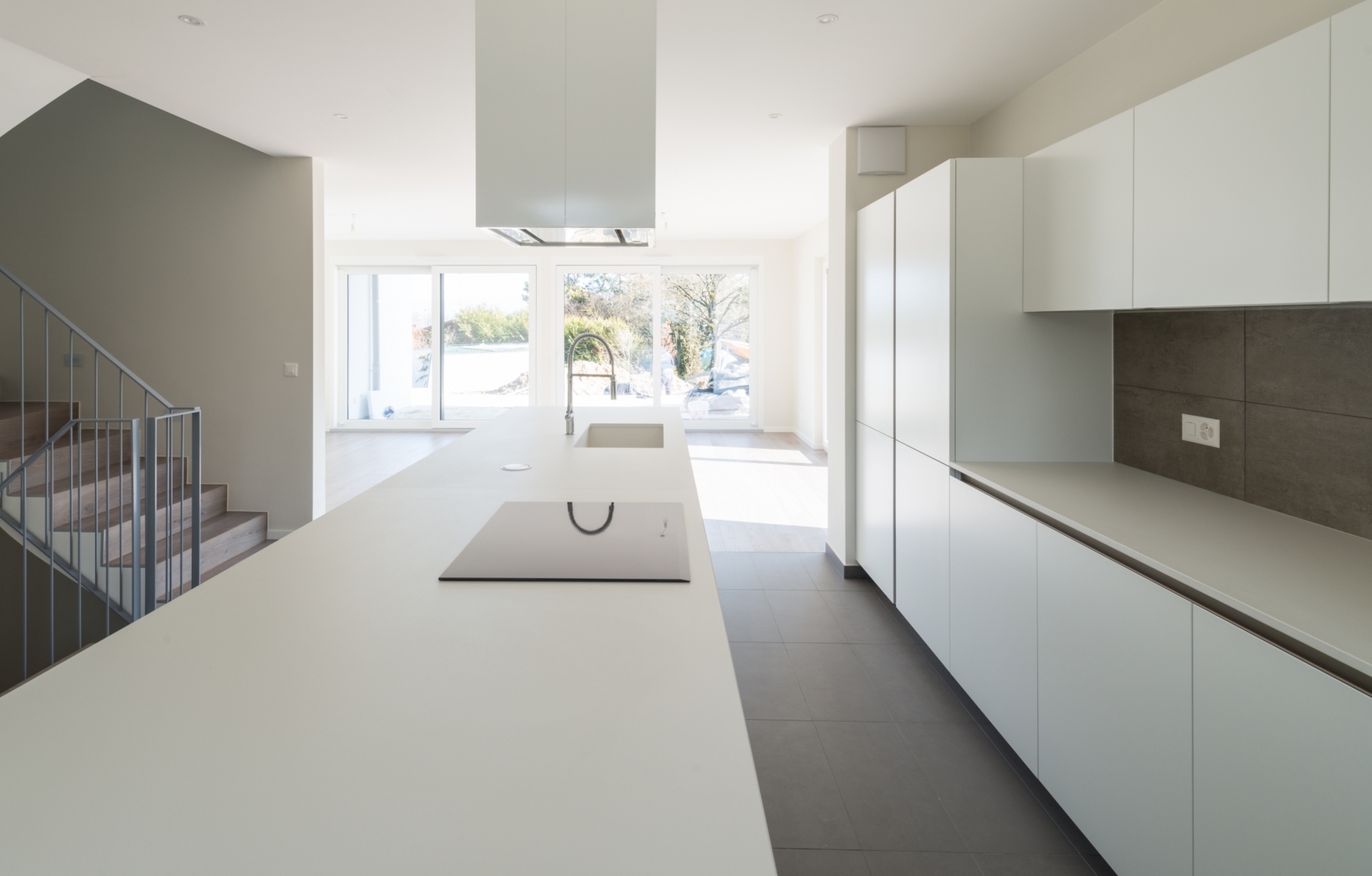 L’espace lumineux et épuré met en valeur la simplicité des lignes et l’attention portée aux matériaux. Les larges baies vitrées laissent pénétrer la lumière naturelle, offrant une ouverture généreuse vers l’extérieur et intégrant la nature environnante au sein de l’habitat. Ce jeu de transparence crée un dialogue fluide entre intérieur et extérieur, tout en maximisant les apports lumineux pour un confort thermique optimal. L'agencement de la cuisine ouverte, avec son îlot central, ajoute une touche de fonctionnalité contemporaine, renforçant l’idée d’un espace de vie convivial et modulable.