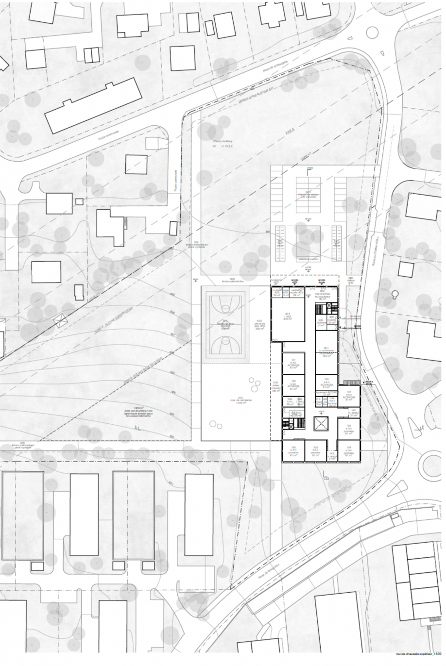 Les volumes ont été implantés afin de répondre à la jonction que l'on peut observer entre deux échelles urbaines, tout en favorisant les connexions piétonnes publiques. D'une part au Nord, le volume profite de la pente pour minimiser son rapport l'échelle des villas. Ceci lui permet d'émerger au Sud de la parcelle et ainsi de prendre place dans une échelle urbaine plus dense.