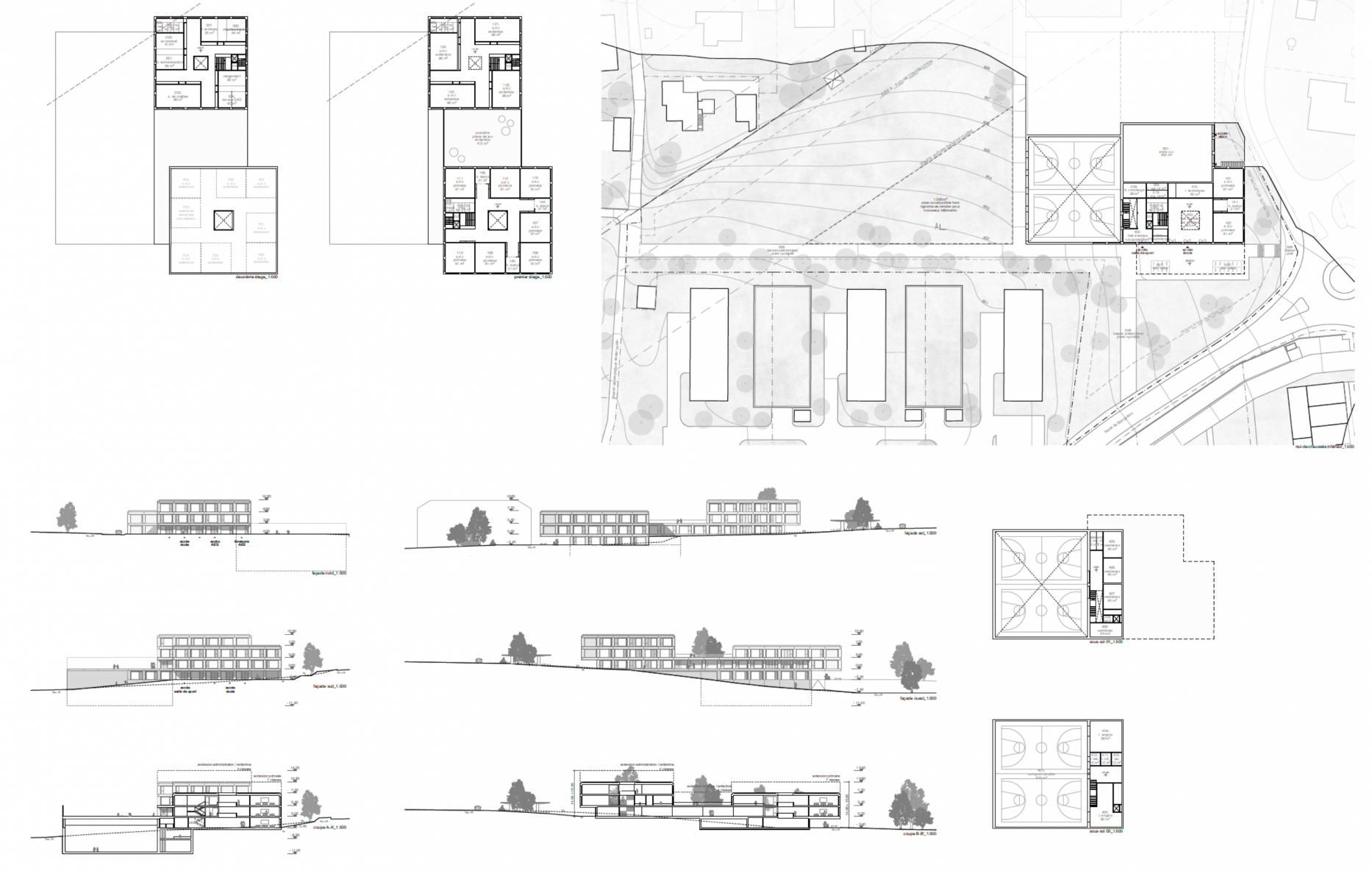 La volumétrie proposée permet d'optimiser la lisibilité des différents espaces programmatiques, tout en facilitant leur liaison. Les 3 programmes se répartissent en 3 volumes distincts, formant un ensemble cohérent. Ces volumes sont reliés par 2 Rez-de-chaussée, inférieur et supérieur, induits par la pente du terrain, par les relations au contexte urbain ainsi que par les différents accès proposés. La répartition par strates du programme offre la possibilité de proposer au niveau supérieur un espace de récréation distinct pour les plus petits, en liaison directe avec l'école enfantine.