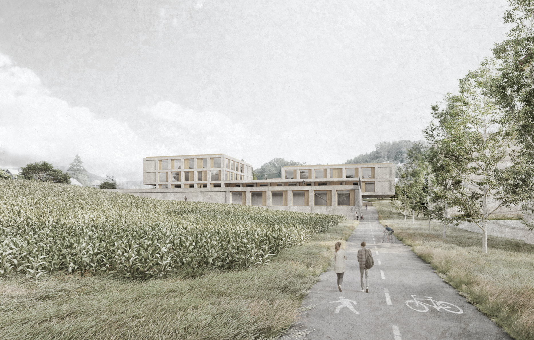 Nous tirons alors profit de cette implantation pour offrir deux entrées distinctes au bâtiment. Le front bâti côté Ouest permet de protéger la place de jeux par rapport à la route tout en profitant de la percée visuelle vers le paysage fribourgeois