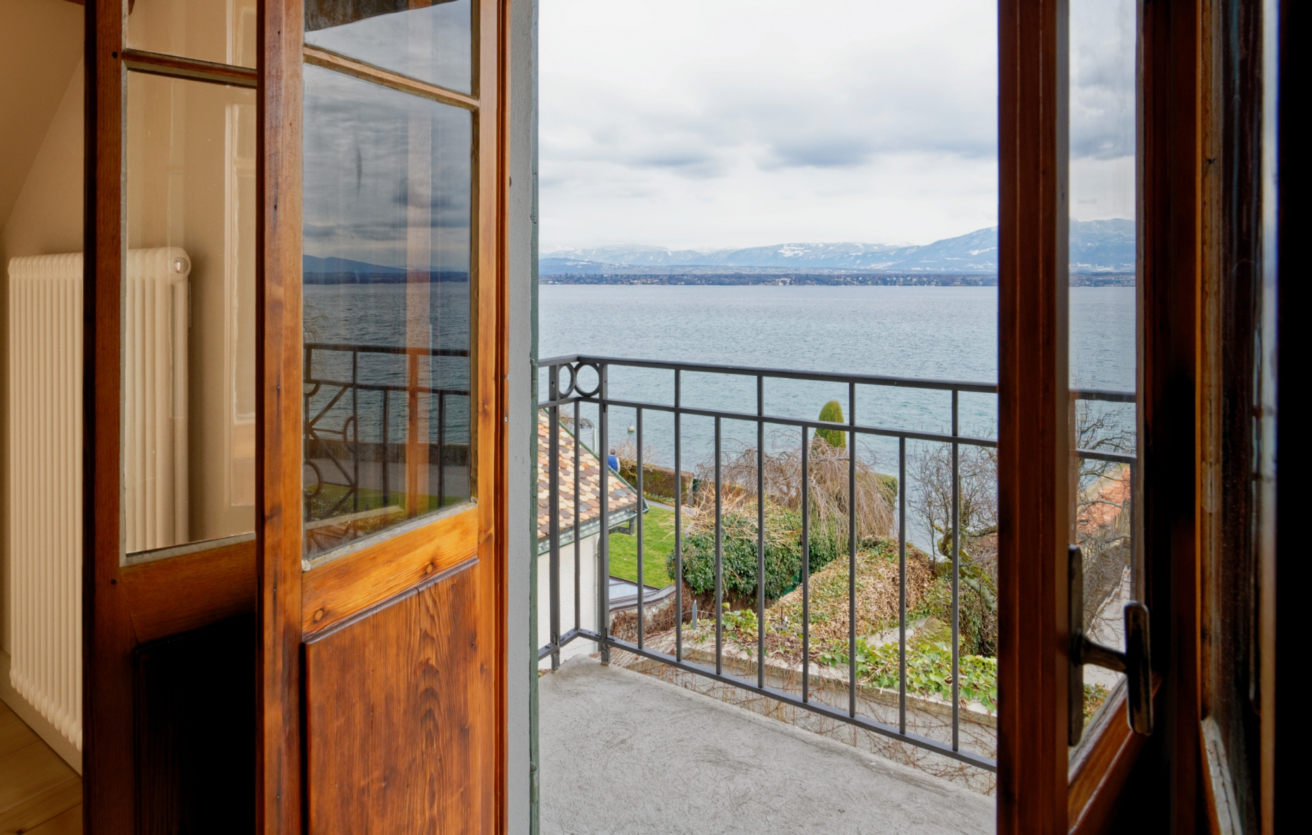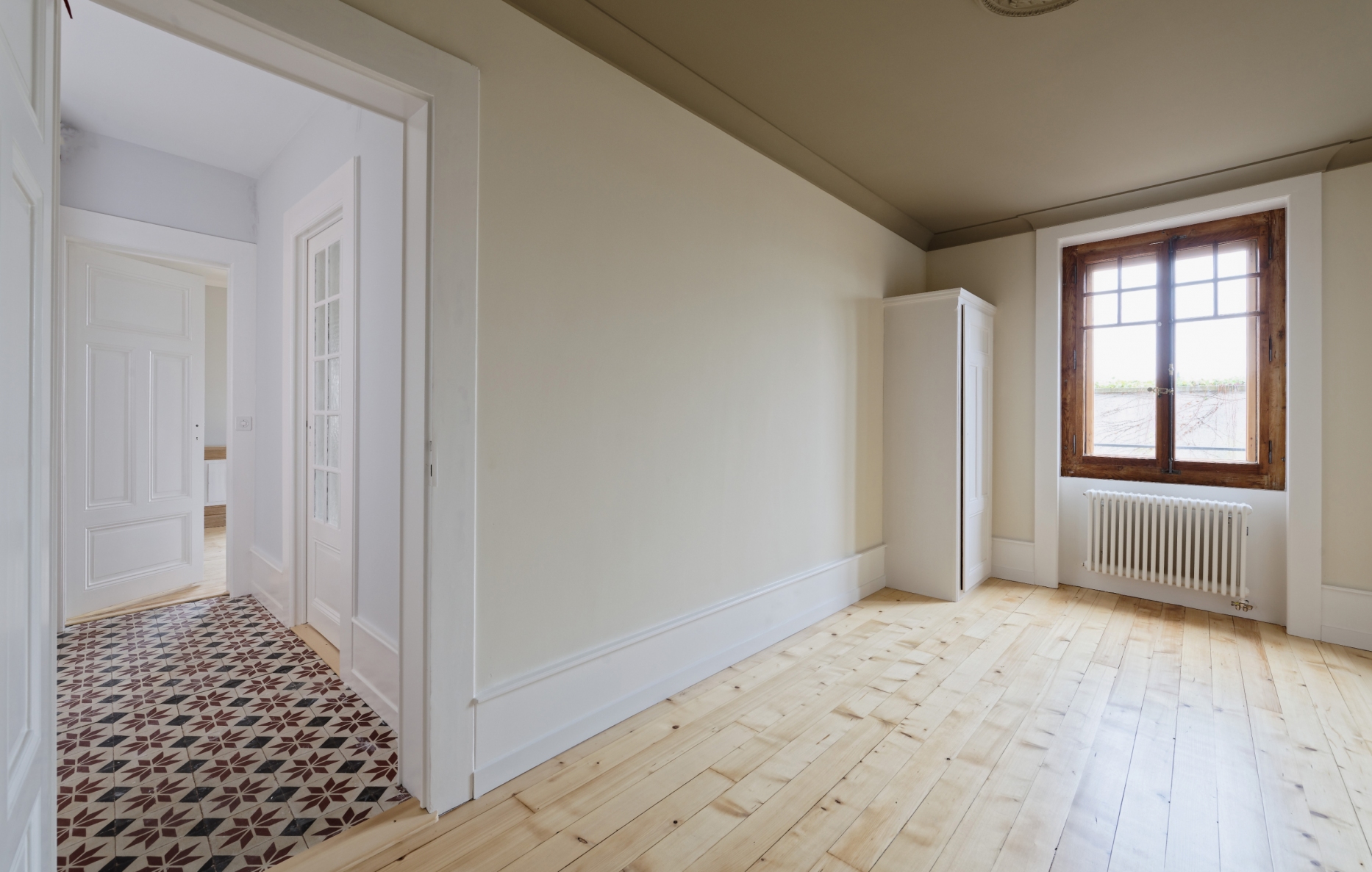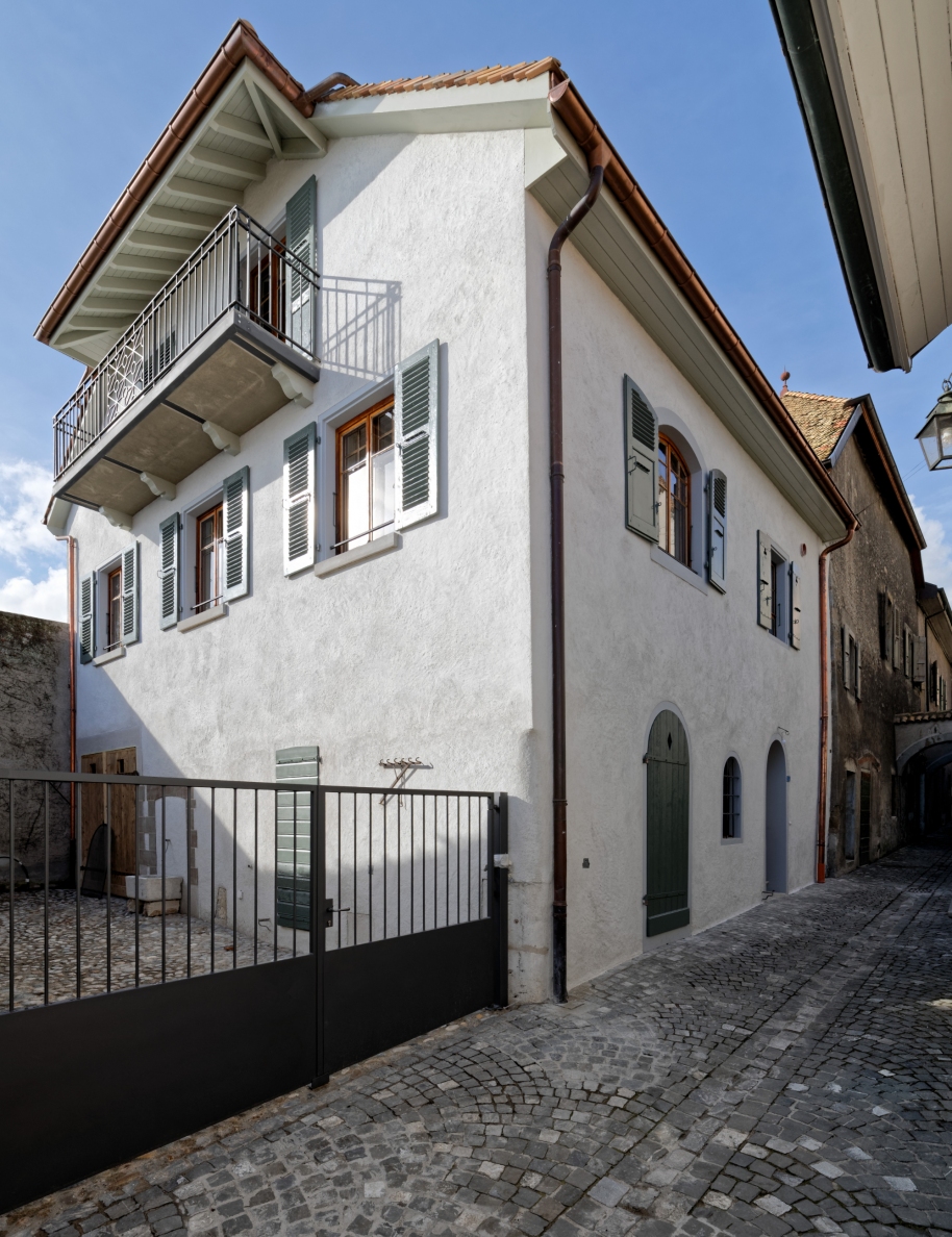 Fondé au 13e siècle, le bourg se développe d’abord autour de l’activité des moulins. Les matières premières proviennent essentiellement de la côte et de l’arrière-pays, riches en vignes, pâturages et forêts. Difficile à maîtriser, le lac apparaît comme un vecteur de problèmes, charriant le froid et l’humidité, propageant les miasmes depuis ses marais. Serrées les unes contres les autres, les maisons de Coppet offrent donc leurs façades à la rue et tournent le dos à ce Léman inamical. Présente sur le cadastre de 1640, la bâtisse qui nous occupe ici s’inscrit pleinement dans ce contexte rural, avec grange et écurie, cour et verger. Cette simplicité ordinaire tiendra jusqu’au 19e siècle où, avec la découverte du lac comme élément de valeur (intérêt pour le grand paysage, tourisme, plaisance), elle perdra son affectation paysanne. La maison se transforme en lieu d’habitation et s’embourgeoise, comme en témoignent les corniches moulurées, les parquets, les portes à panneaux et le carrelage aux motifs colorés. Peu remanié au fil des générations, le volume conserve jusqu’au 21e siècle ses caractéristiques : sous un toit à deux pans avec demi-croupe, un rez-de-chaussée qui sert avant tout de remise, un premier étage avec des pièces à vivre, un comble avec deux chambres et un grenier.