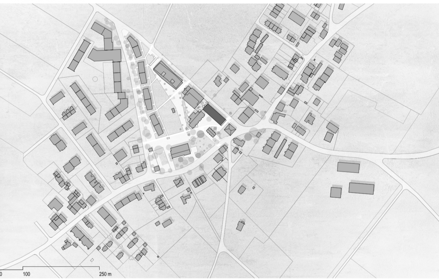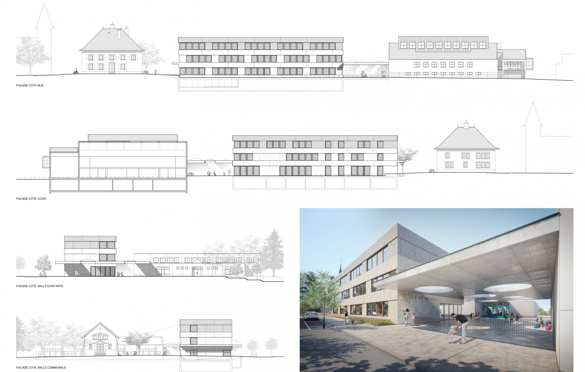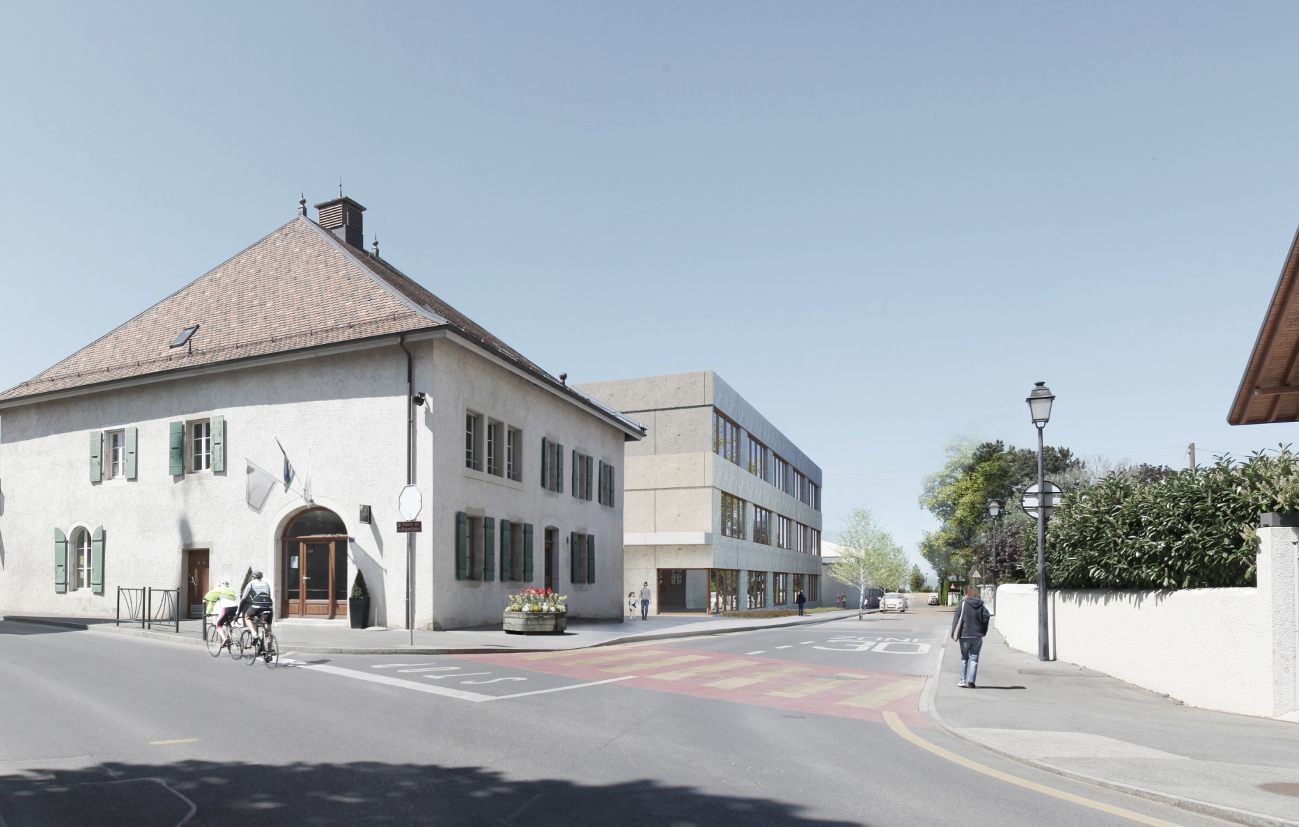 Ce nouvel ensemble se détache du bâtiment du XIXe qui, libéré de son programme scolaire, retrouve sa place en tant que bâtiment majeur communal ponctuant les abords de la route de Gy. Le jardin attenant, à l’instar du verger existant de l’autre côté du Centre Meinier la Rampe, devra permettre une liaison visuelle forte entre la route de Gy et les espaces ouverts côté école. La liaison visuelle avec la route principale est accompagnée d’une perméabilité des accès depuis la route de La Repentance.