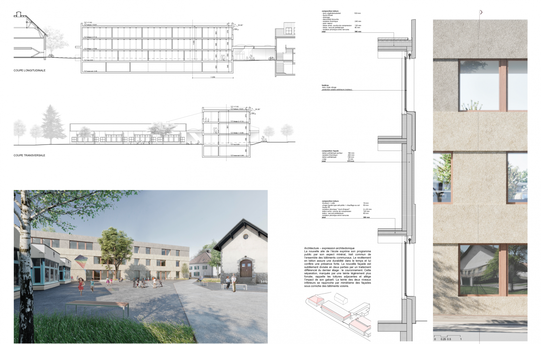 La nouvelle aile de l’école exprime son programme public par son aspect minéral, trait commun de l’ensemble des bâtiments communaux. Le revêtement en béton assure une durabilité dans le temps et lui confère une présence forte. La nouvelle façade est subtilement divisée en deux parties par un traitement différencié du dernier étage : le couronnement. Cette séparation, marquée par une teinte légèrement plus foncée, rappelle les toitures adjacentes et allège l’impact de son gabarit. La teinte des deux niveaux inférieurs se rapproche par mimétisme des façades sous corniche des bâtiments voisins.