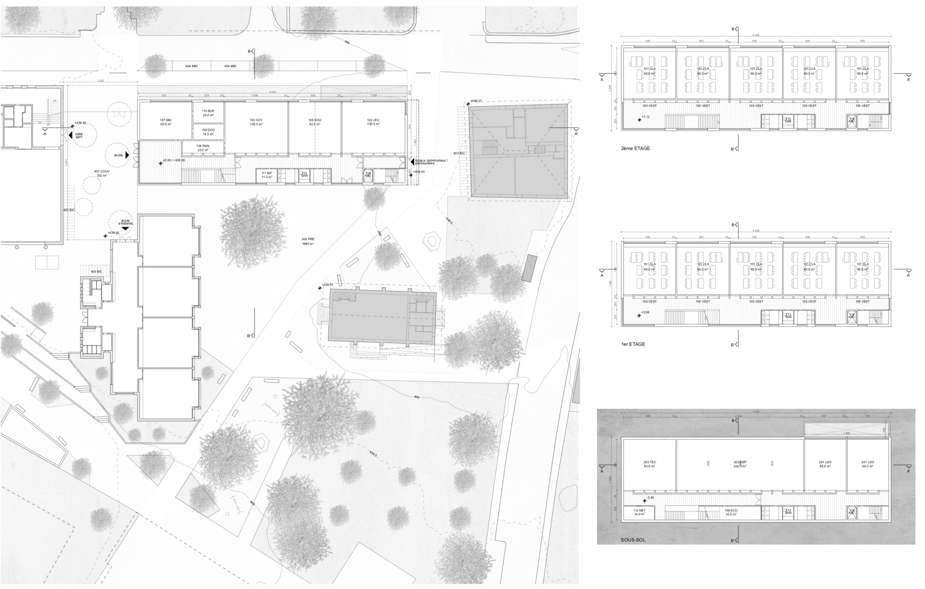 La distribution programmatique est claire : elle sépare les salles de classe (étages supérieurs), des espaces scolaires communs et parascolaires (rez-de-chaussée) et des espaces communaux (sous-sol). Ces derniers bénéficient d’une entrée indépendante côté route de Gy.