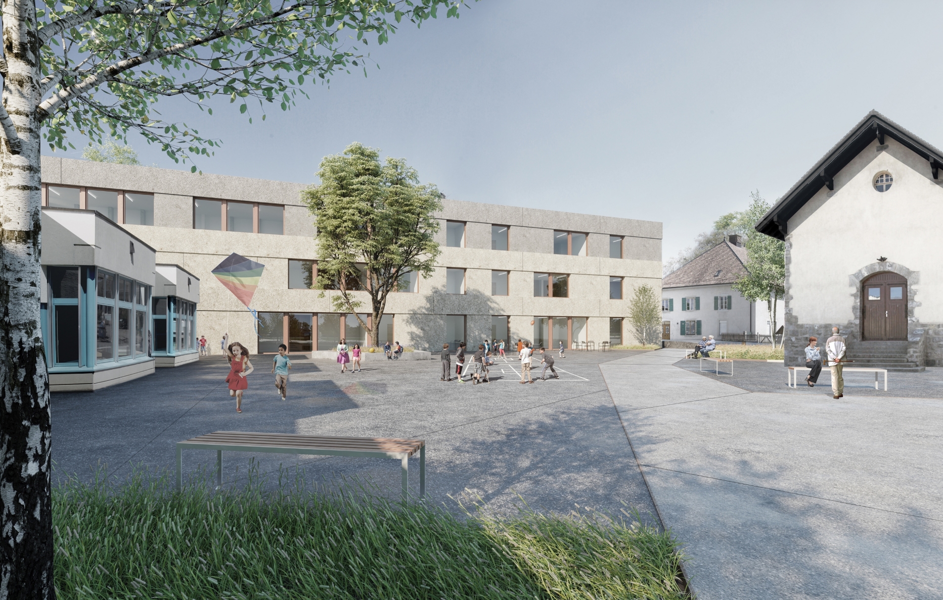 La nouvelle aile de l’école se détache du bâtiment XIXe et lui laisse la distance nécessaire de par son échelle. Cette reconnaissance est renforcée par l’alignement côté route de La-Repentance, un retrait qui requalifie cette route à proximité du centre du village en donnant au trottoir des dimensions plus généreuses. La casquette prolongeant le couvert du préau marque l’entrée de l’école ainsi que la liaison piétonne avec les espaces de jeu et détente au cœur de l’ilot.