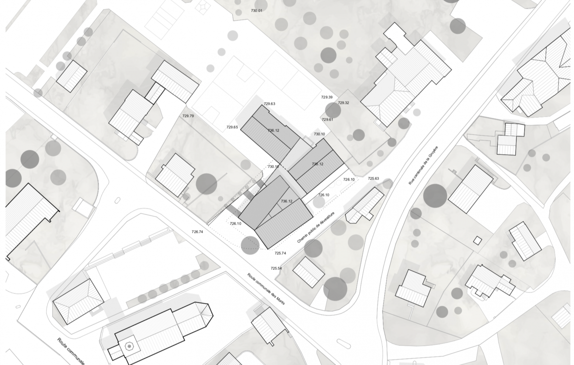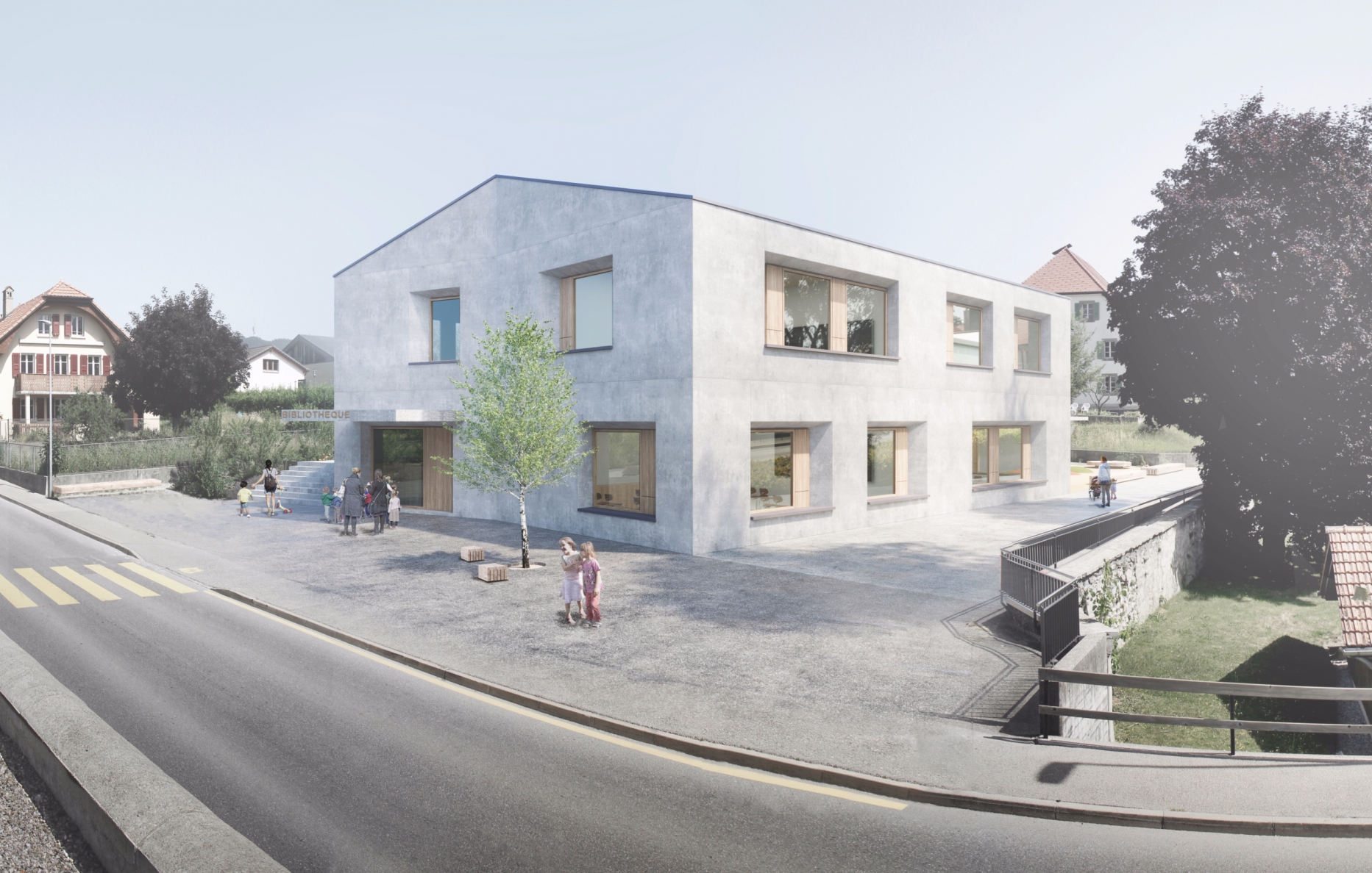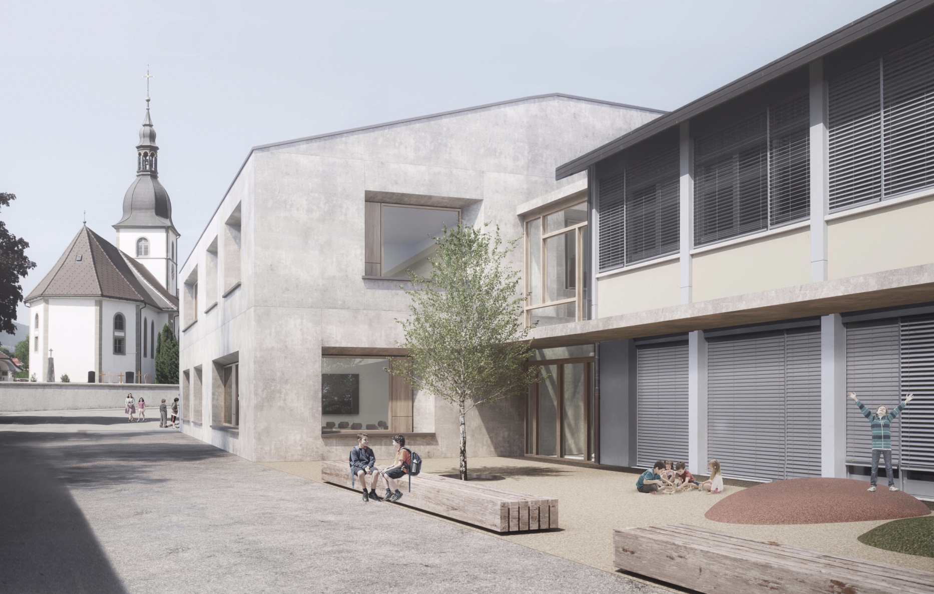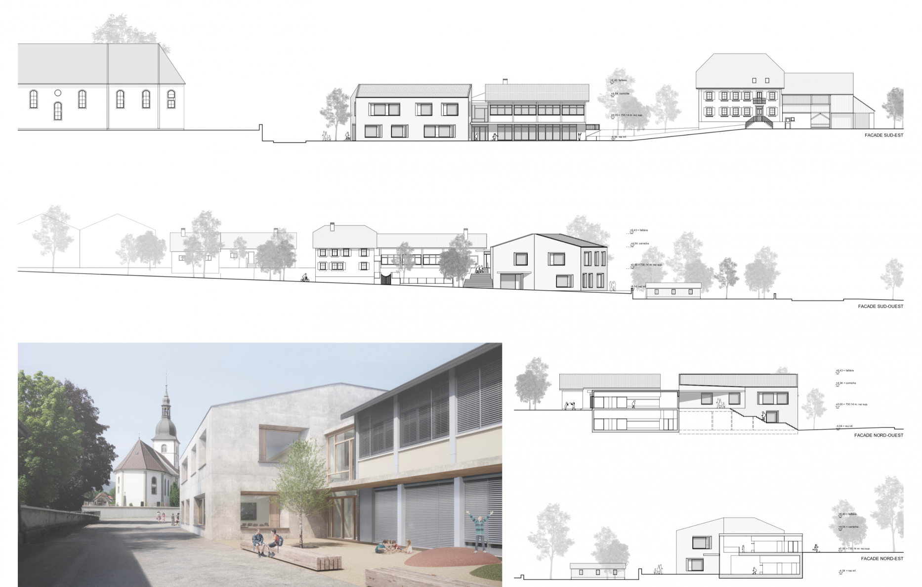 Situé à l’intersection de deux rues au coeur du village, le nouvel ensemble constitue la tête de pont du futur développement du plateau « Aigle Noir ». La géométrie de la nouvelle construction répond au contexte immédiat : les bâtiments scolaires adjacents ainsi que l’église du village tout proche. De faible gabarit, le corps additionné utilise une aire d’implantation très restreinte. Tout en restant dans des géométries orthogonales dans l’organisation des espaces intérieurs, le bâtiment se plie pour ouvrir le préau sur la desserte piétonne et en même temps ouvre la perspective sur l’église. Cette perspective est accentuée par l’orientation du faîtage - typique de la région, parallèle aux courbes de niveaux. En retrait par rapport à la rue des Monts, la nouvelle aile de l’école crée une place par laquelle on accède au rez supérieur de l’école ainsi qu’à la bibliothèque qui peut être ouverte au public.