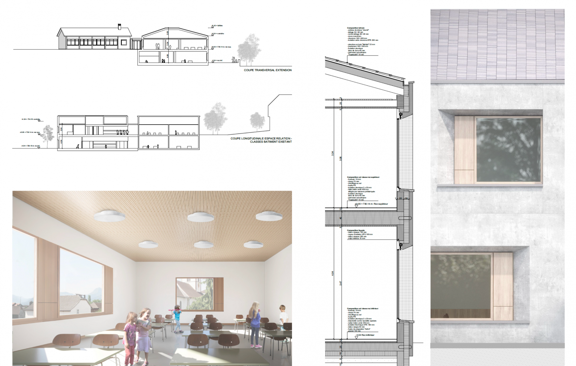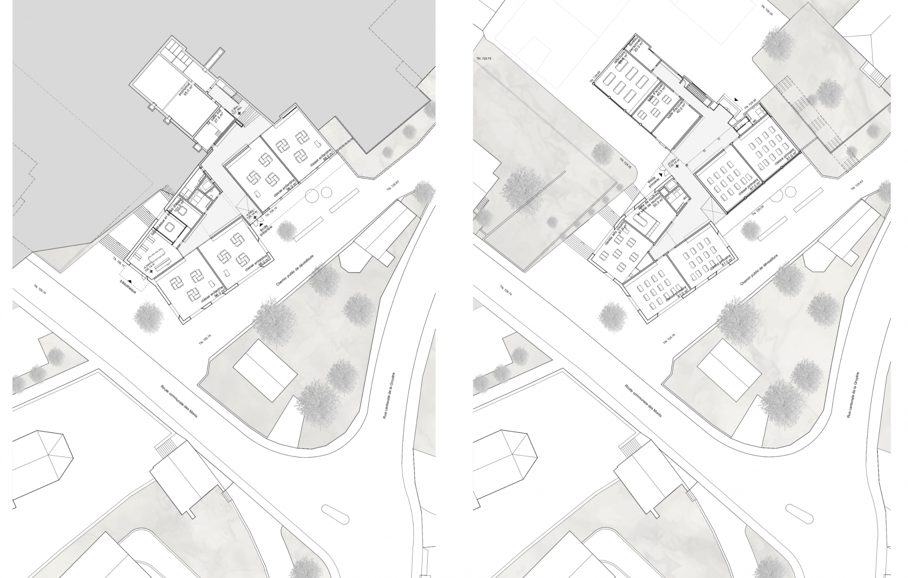 Organisé sur deux niveaux, le bâtiment sépare clairement le programme demandé. Le rez inférieur regroupe les classes de l’école enfantine qui permettent l’accès de plain-pied aux piétons et poussettes minimisant ainsi l’utilisation des escaliers. Au rez supérieur se trouve l’école primaire dont on conserve le principe de plusieurs entrées. Egalement au rez supérieur sont disposés les espaces extrascolaires ainsi que le réfectoire. Ces derniers, disposés dans l’aile existante, pourront permettre au besoin, un fonctionnement indépendant. Au rez inférieur la bibliothèque - jointe avec les classes d’appuis - bénéficie d’un accès direct depuis la rue communale permettant ainsi une utilisation différenciée. Cette séparation programmatique facilite le phasage des travaux, permettant dans un premier temps l’utilisation complète des bâtiments existants. La nouvelle aile construite permet un transfert alterné des classes libérant séparément les deux niveaux des ailes existantes à transformer.