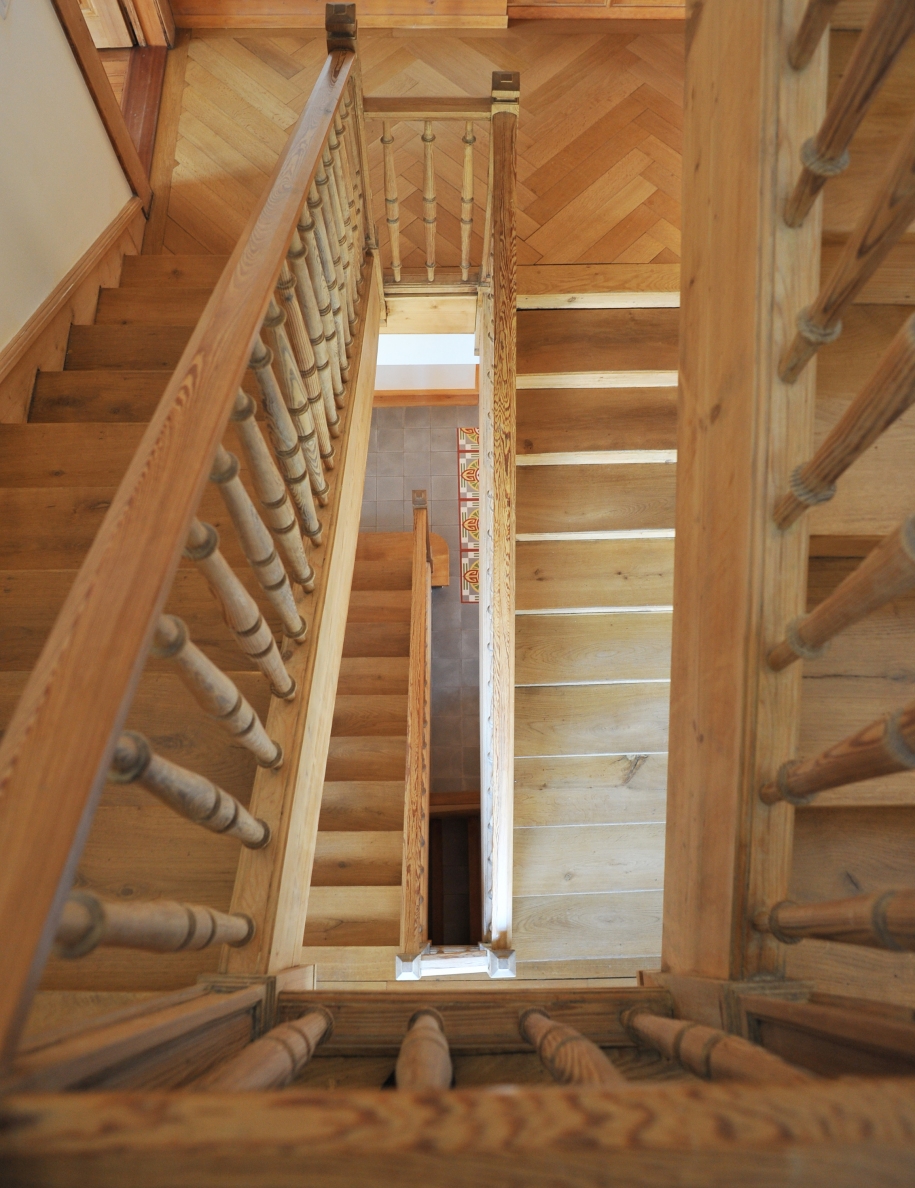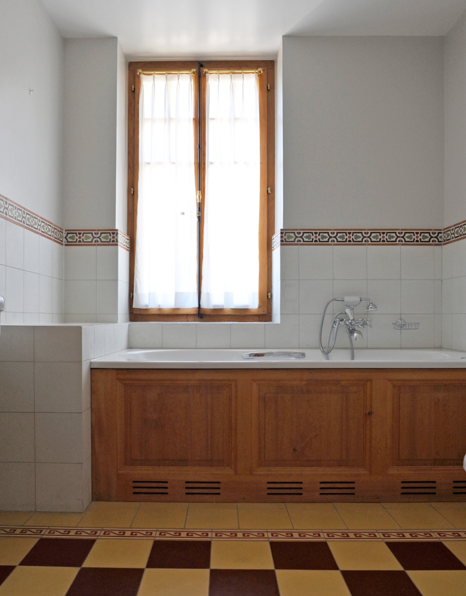 Les apports visant l’amélioration de l’habitabilité et du confort préservent la substance centenaire. Le chauffage, l’électricité et les sanitaires sont notamment refaits à neuf dans le respect de l’identité du lieu. Les éléments anciens caractéristiques se voient remis en état (poêle en faïence) ou restaurés selon un savoir-faire traditionnel (boiseries, parquets, corniches). Arrivées en fin de vie, les menuiseries extérieures ont été entièrement changées. Désormais équipées de vitrages isolants, leur image générale est conservée, de même que le principe constructif et le type de ferrements. Des choix efficaces et discrets, à l’image de la salle de bain conçue dans une chambre et traitée presque comme un meuble autonome, des carreaux de ciment polychromes posés au sol des espaces les plus sollicité ou encore des gaines techniques créées aux angles du palier de l’escalier intérieur.