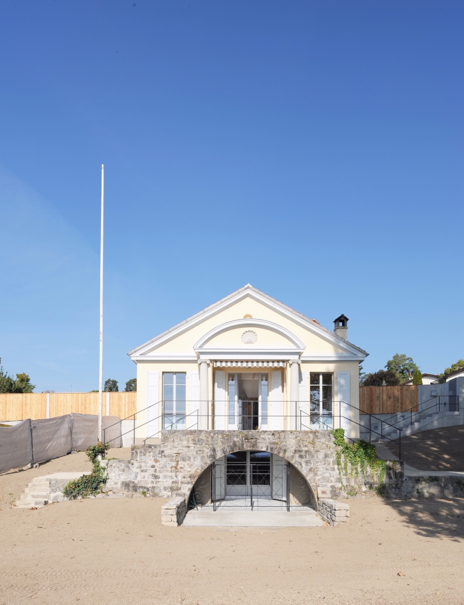 Associant aménagements mineurs ou améliorations techniques conséquentes, chacune des interventions a d’abord été pensée en termes de discrétion, pour en limiter l’impact visuel. L’élégance retrouvée du bâtiment contribue pleinement à la revalorisation du site. Bien que de dimensions modestes, l’ancien pavillon de bain trône à nouveau sur cette rive et laisse au second plan les deux villas neuves réalisées à proximité et l’indispensable mur antibruit construit le long de la route.