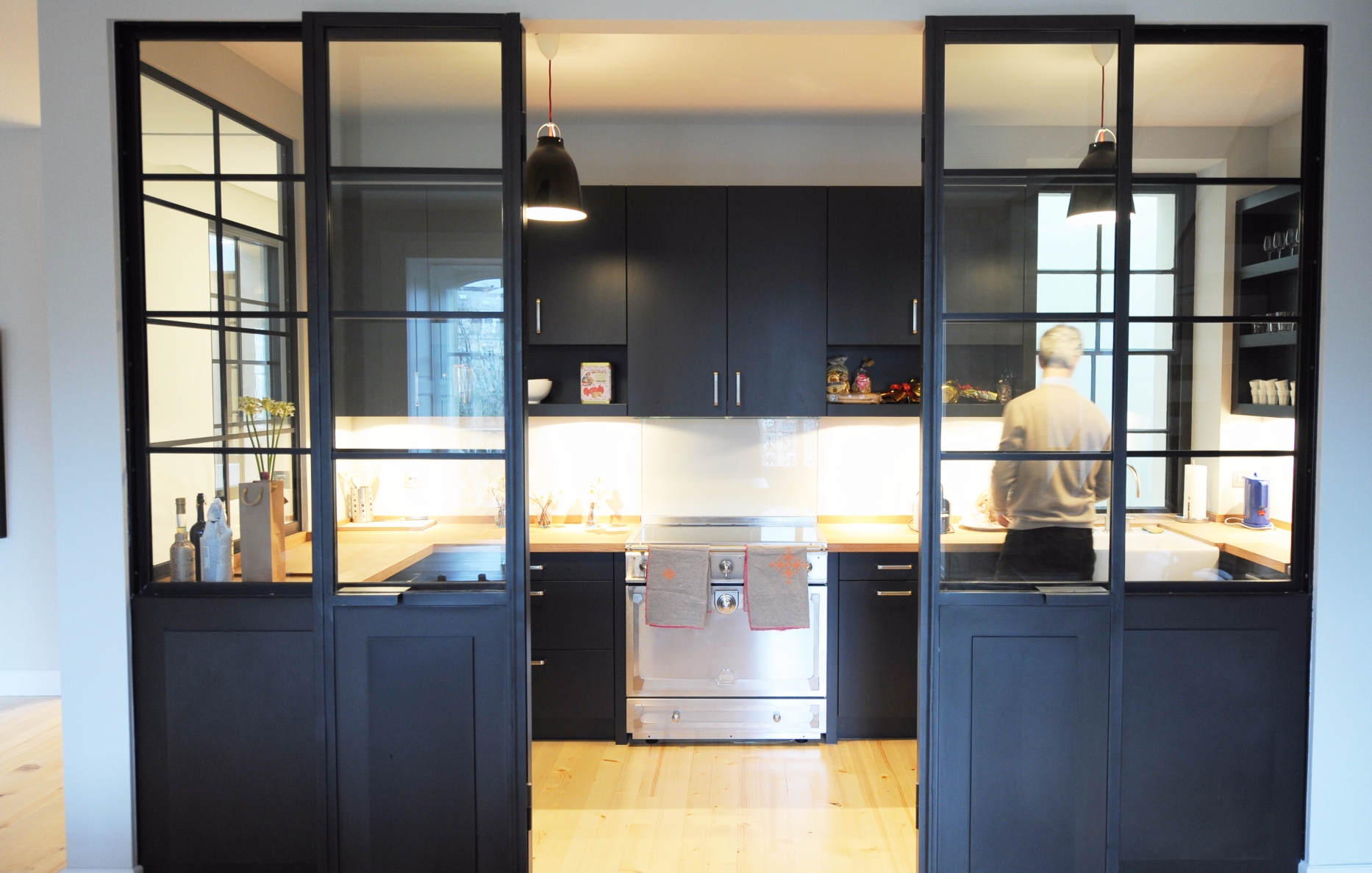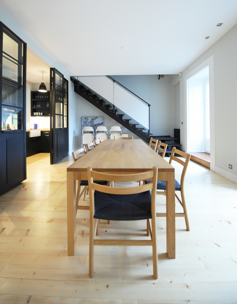 Le plan remanié se concentre autour des noyaux formés par les deux courettes intérieures. Revalorisées, ces dernières offrent des jeux de transparence inattendus et apportent un éclairage naturel jusqu’au cœur des espaces. Lorsqu’elles se trouvent liées aux parois d’origine, les boiseries et les bibliothèques sont traitées de façon classique, alors que les éléments propres au nouvel aménagement – cuisine, salle de bains ou escalier intérieur par exemple – adoptent une expression nettement tranchée, sobre et contemporaine. Sur les traces d’un ancien salon mutilé, la surface réduite du beau parquet à panneaux est assumée pour elle-même, complétée par de grandes lames de pin filant à travers les autres pièces. Neuves, les fenêtres donnant sur l’extérieur sont construites à l’ancienne, avec petit-bois, verres posés à bain de mastic et espagnolettes ; celles tournées sur les courettes sont réalisées en métal mais conservent leur partition originale. Sous une toiture remise à neuf (isolation, calibrage des ouvertures), les combles proposent des surfaces agréables, aménagées autour des pièces maîtresses d’une charpente séculaire.