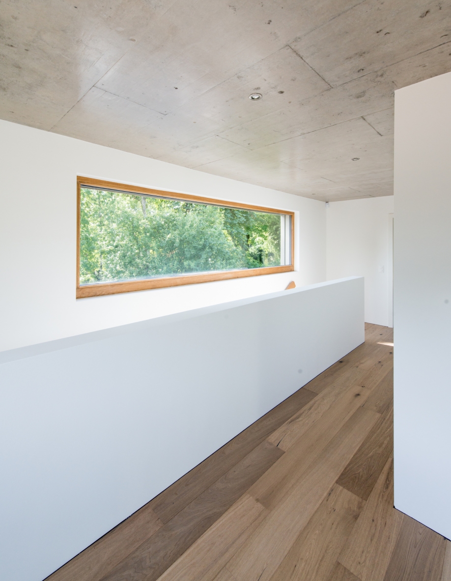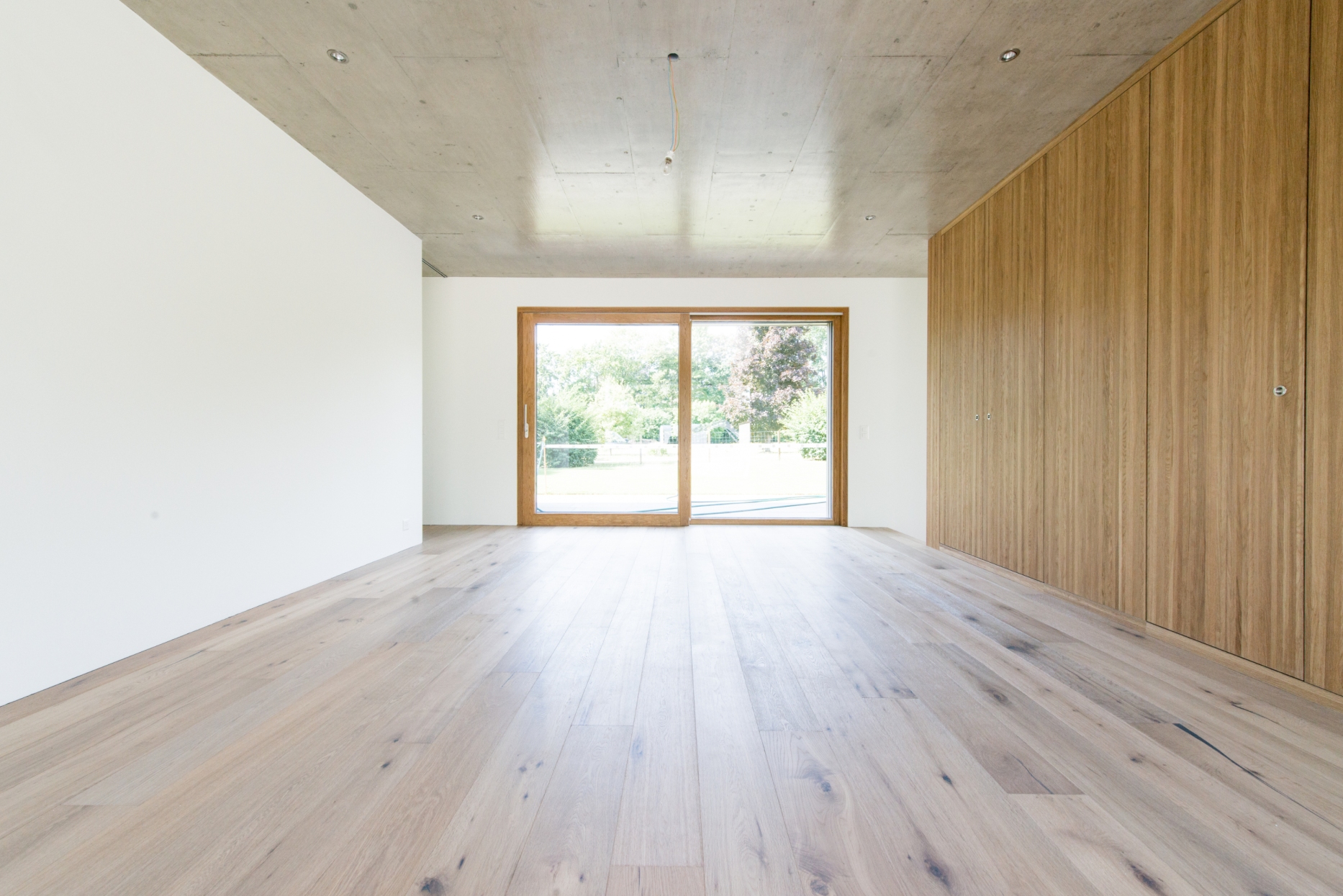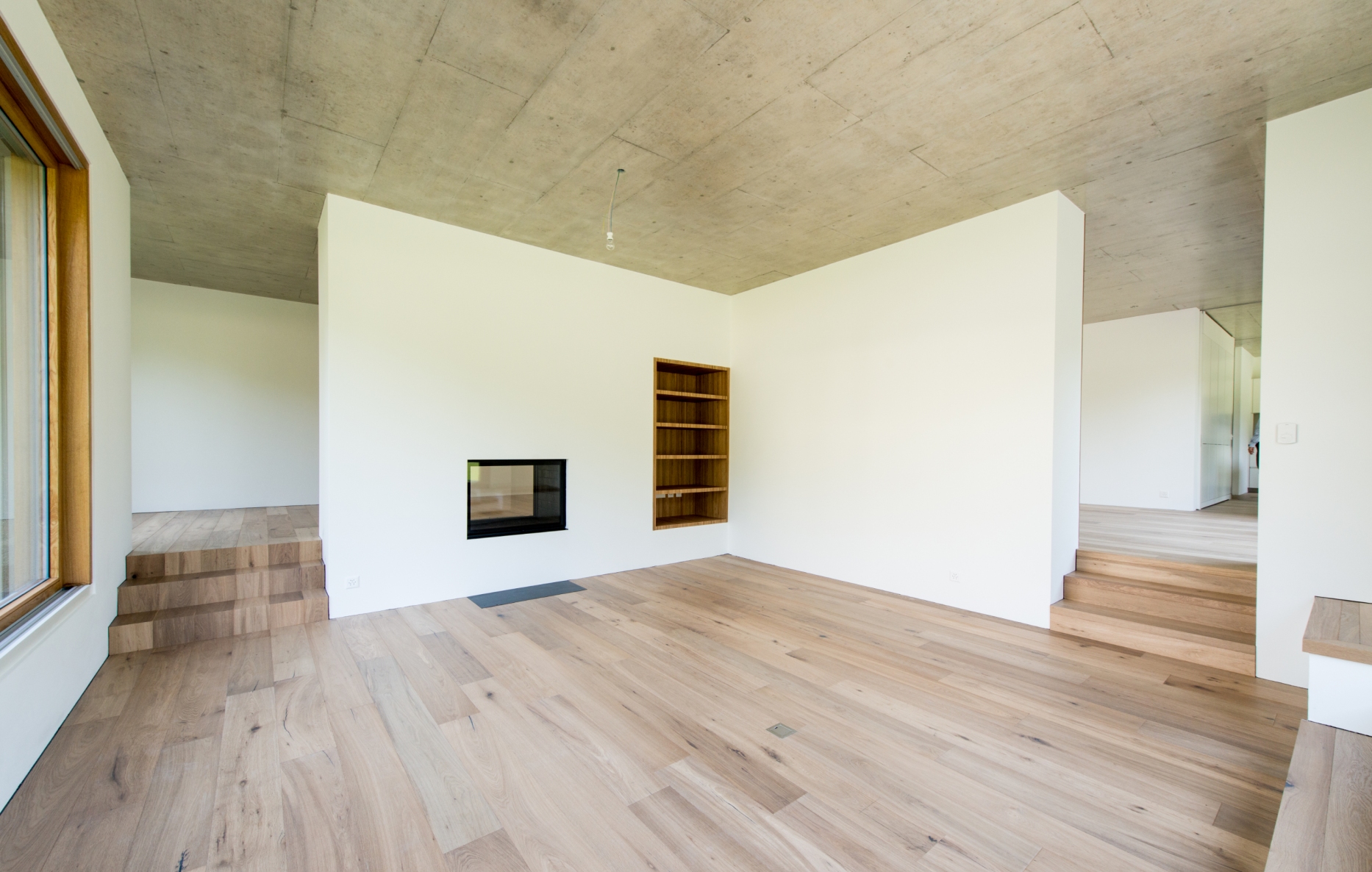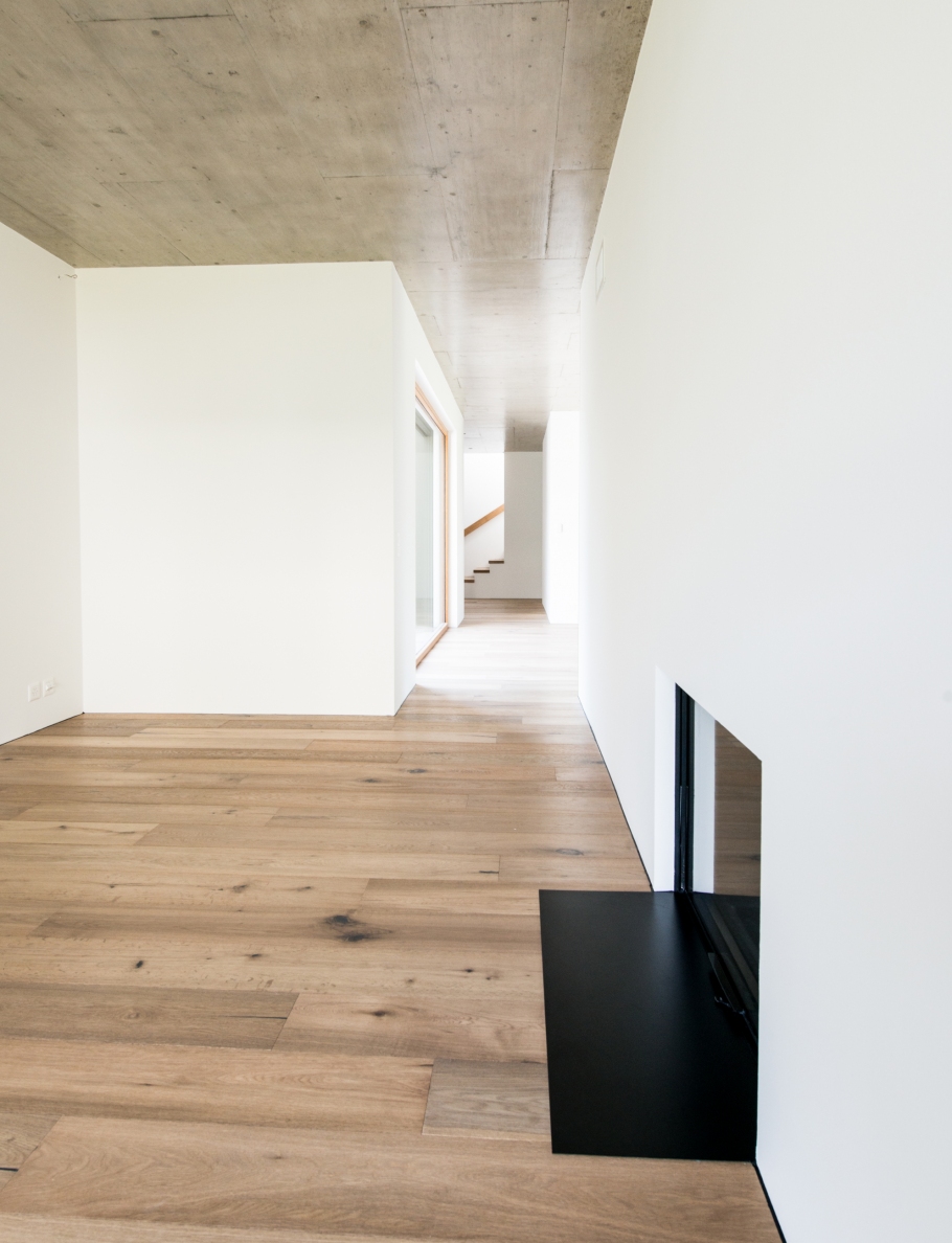 Pour l’aménagement intérieur, de très beaux sols en chêne courent sur toute la surface de l’habitation. Les longues lattes en bois du parquet répondent aux grandes dalles du plafond dont le béton brut a été laqué pour produire un effet soyeux, brillant et chaleureux. Les spots encastrés dans le plafond accentuent la touche contemporaine.