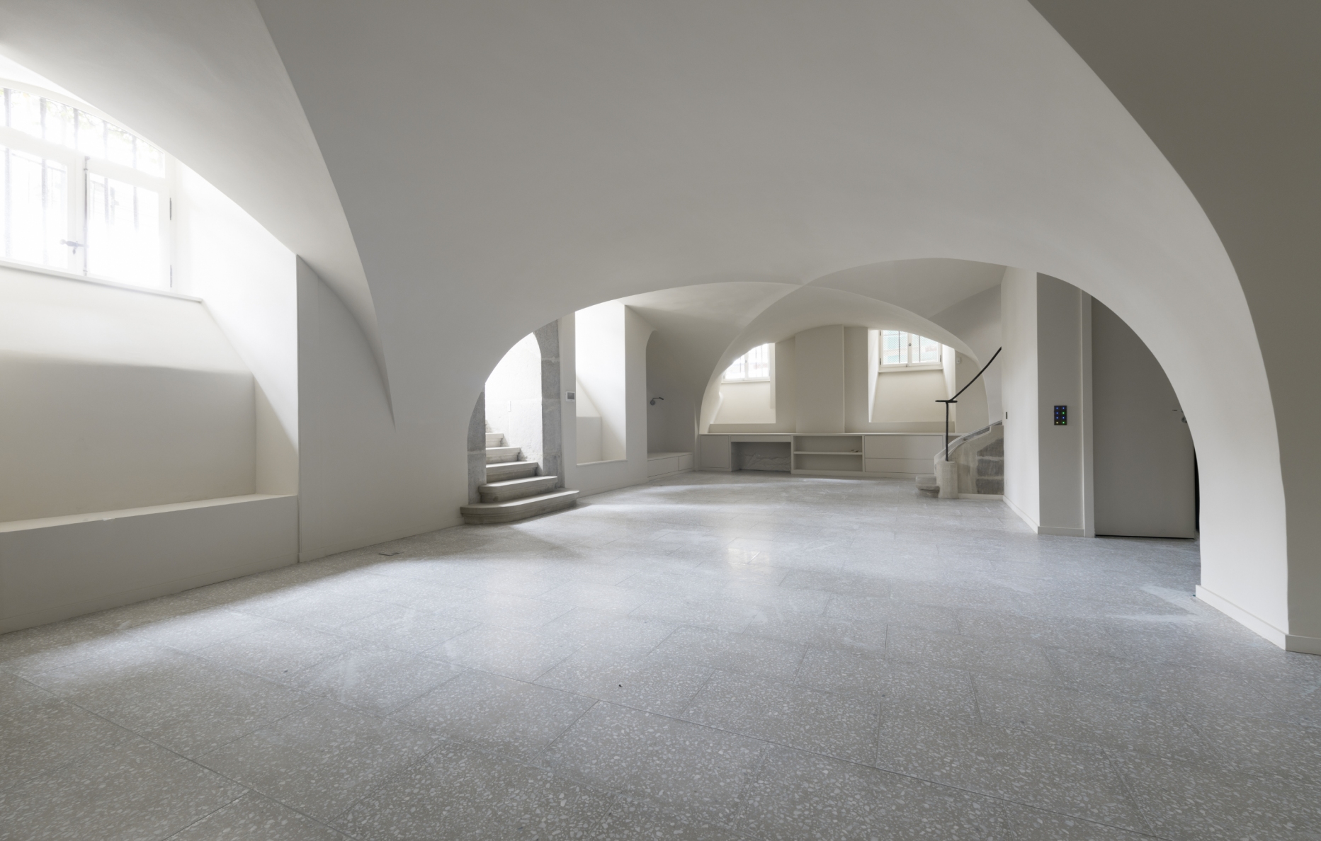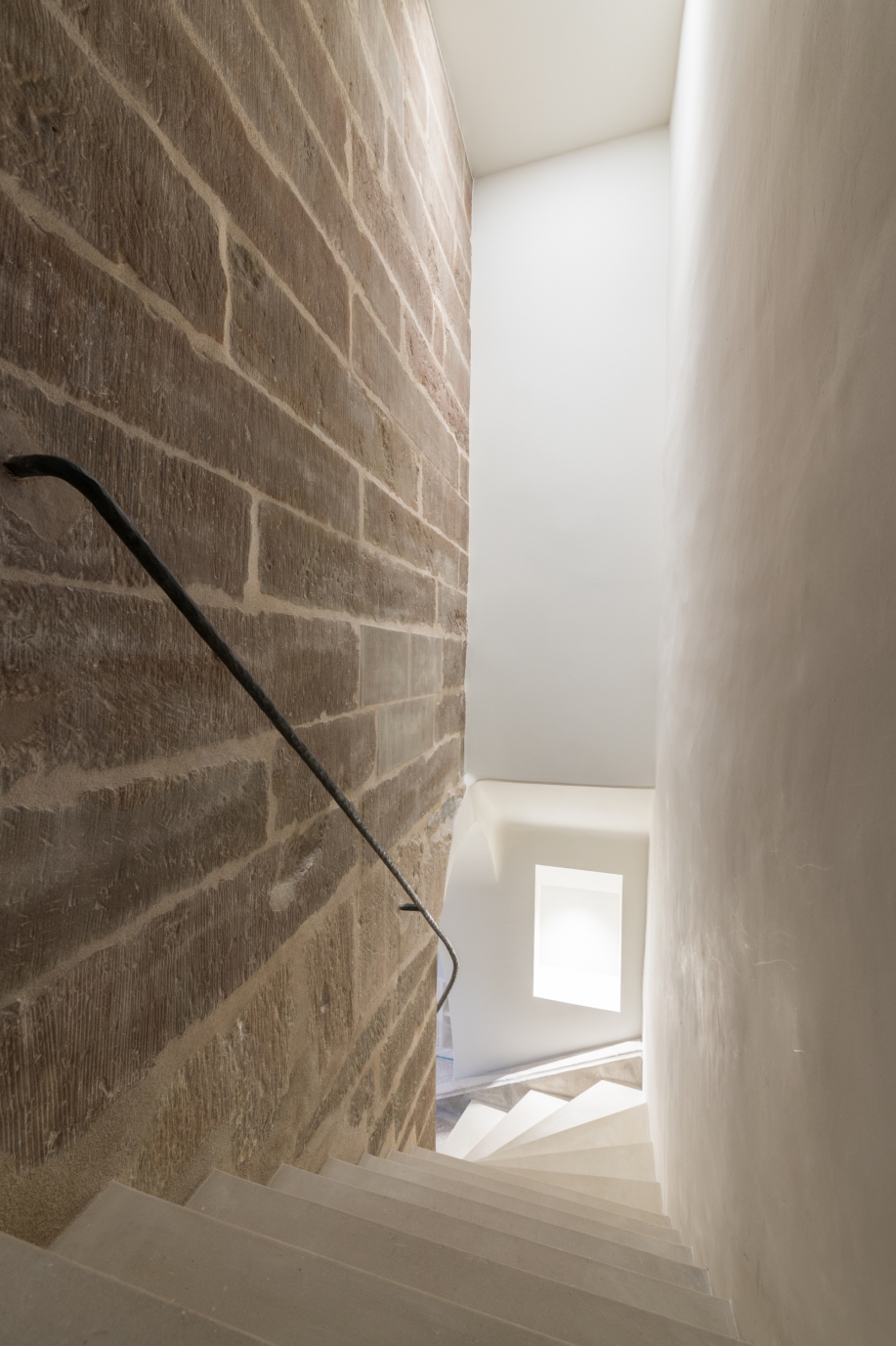 Cette volonté d’affirmer l’authenticité de la matière se lit également dans la présence de matériaux simples et naturels, utilisés de façon contemporaine pour les éléments à créer et revalorisés avec soin dans les espaces existants. Par exemple, les combinaisons de mobilier qui prennent place dans les niches de l’étage inférieur sont en bois massif ou, si les dimensions ne le permettent pas, en panneaux agglomérés écoresponsables ; dans l’escalier, le splendide mur de molasse appareillée du 18e siècle enfin débarrassé de son épais badigeon dialogue avec la main courante neuve aux volutes modernes, mais au fer brut forgé et martelé à l’ancienne.
