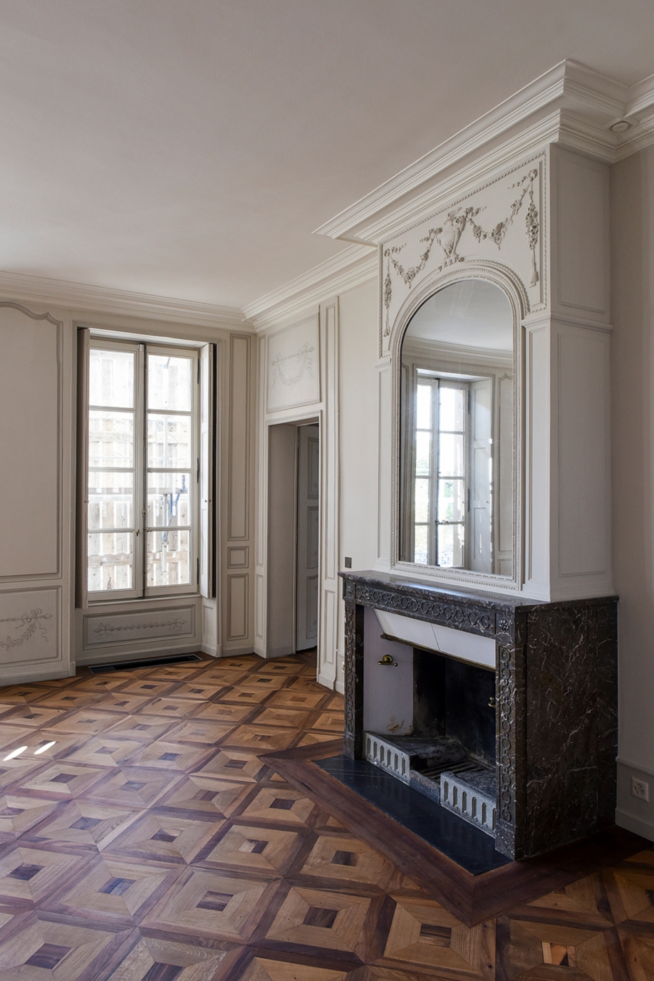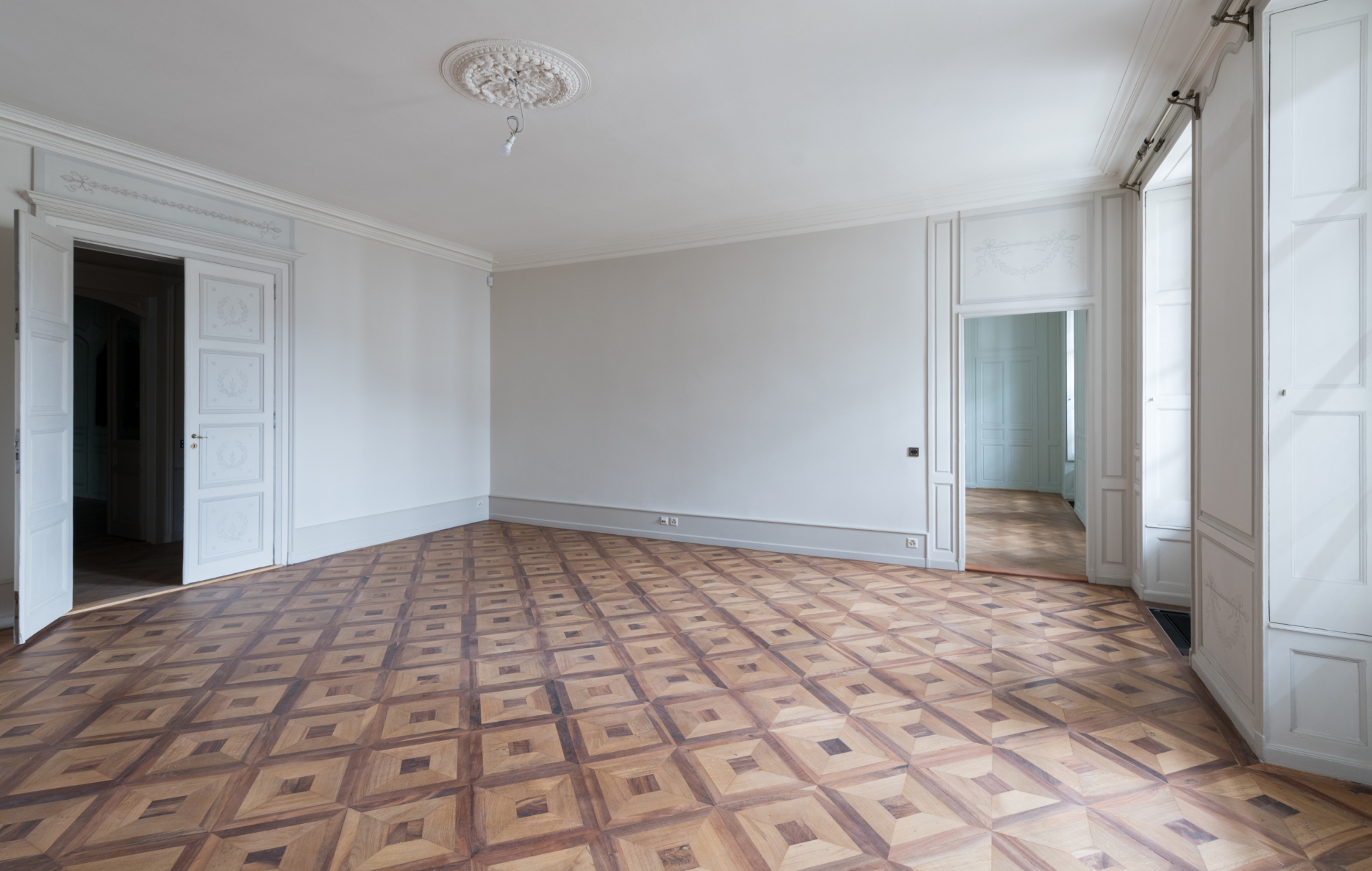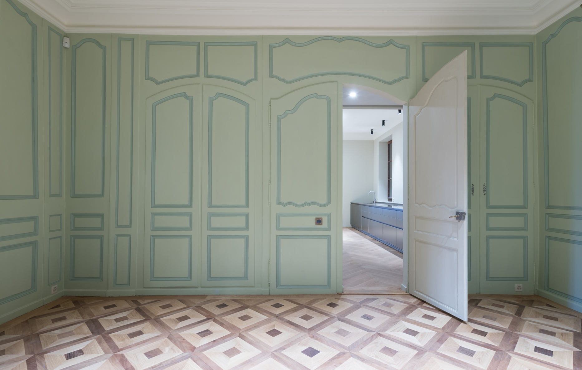 Situé au numéro 2 de la rue Beauregard, en tête d’îlot et ouvert sur trois façades, le logement en question fonctionne en duplex. Le rez-de-chaussée fait rayonner autour d’un couloir central une série de pièces d’apparat aux dimensions généreuses et aux finitions de très belle facture (parquets et boiseries, cheminées, moulures et décors). En dessous et relié par un escalier intérieur, un vaste sous-sol offrant quant à lui d’impressionnants volumes voûtés dans une ambiance monacale, éloignée du standing affirmé à l’étage supérieur. Alors que la situation générale laisse percevoir des pièces en parfait état de conservation, un minutieux diagnostic démasque les nombreux changements effectués par les différents propriétaires depuis des décennies. Ce travail accompli in situ et dans les fonds d’archives montre que l’organisation intérieure des espaces de réception a été relativement bien préservée, alors que la création de pièces d’eau a conduit à de conséquentes transformations, qu’il s’agisse d’aménagement de nouvelles cloisons, de revêtements, de mobilier ou d’appareils. Dans le même esprit, on relève des installations techniques aussi encombrantes que vétustes, concentrées essentiellement au sous-sol dans un inexplicable désordre. Un rapport –presque une enquête– stratigraphique divulgue les nombreux repeints subis par les décors et les boiseries. Au-delà des modes et des tendances, cette recherche rigoureuse permet d’identifier les teintes anciennes ou d’origine, ainsi que les différentes techniques de mise en œuvre.
