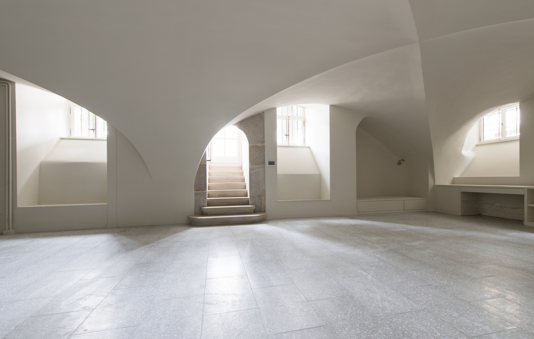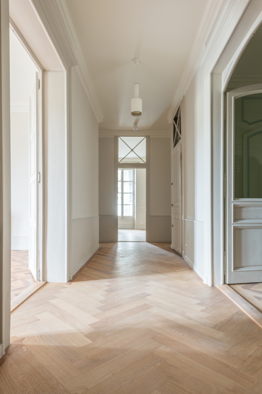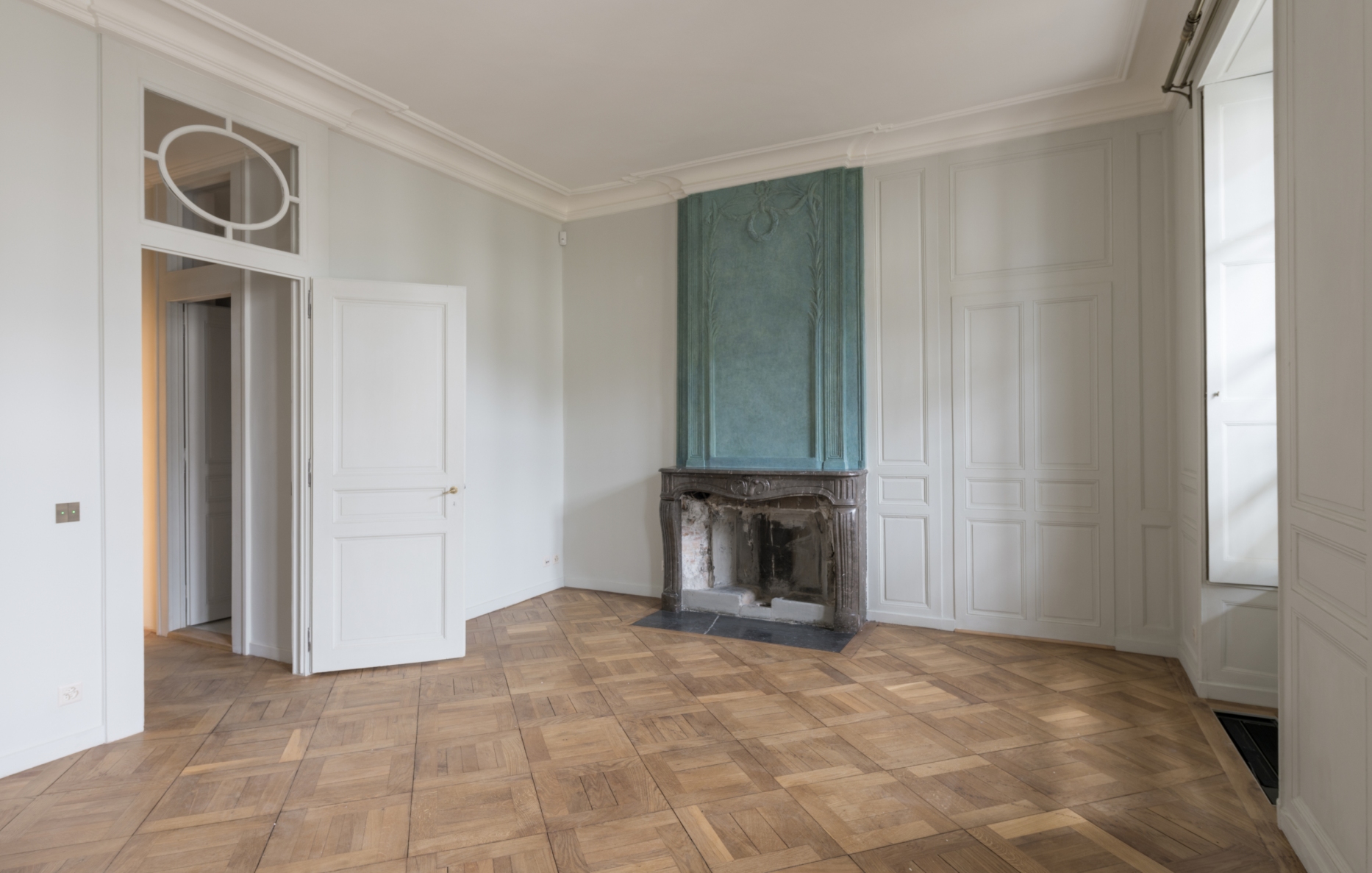 Situé au numéro 2 de la rue Beauregard, en tête d’îlot et ouvert sur trois façades, le logement en question fonctionne en duplex. Le rez-de-chaussée fait rayonner autour d’un couloir central une série de pièces d’apparat aux dimensions généreuses et aux finitions de très belle facture (parquets et boiseries, cheminées, moulures et décors). En dessous et relié par un escalier intérieur, un vaste sous-sol offrant quant à lui d’impressionnants volumes voûtés dans une ambiance monacale, éloignée du standing affirmé à l’étage supérieur. Alors que la situation générale laisse percevoir des pièces en parfait état de conservation, un minutieux diagnostic démasque les nombreux changements effectués par les différents propriétaires depuis des décennies. Ce travail accompli in situ et dans les fonds d’archives montre que l’organisation intérieure des espaces de réception a été relativement bien préservée, alors que la création de pièces d’eau a conduit à de conséquentes transformations, qu’il s’agisse d’aménagement de nouvelles cloisons, de revêtements, de mobilier ou d’appareils. Dans le même esprit, on relève des installations techniques aussi encombrantes que vétustes, concentrées essentiellement au sous-sol dans un inexplicable désordre. Un rapport –presque une enquête– stratigraphique divulgue les nombreux repeints subis par les décors et les boiseries. Au-delà des modes et des tendances, cette recherche rigoureuse permet d’identifier les teintes anciennes ou d’origine, ainsi que les différentes techniques de mise en œuvre.