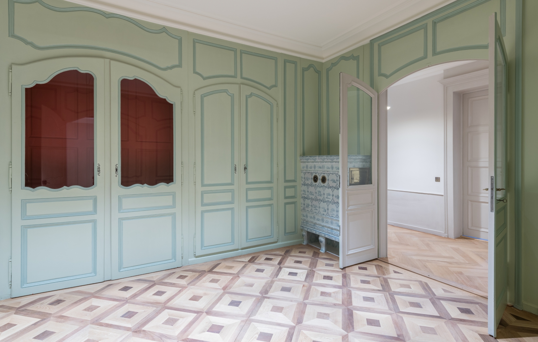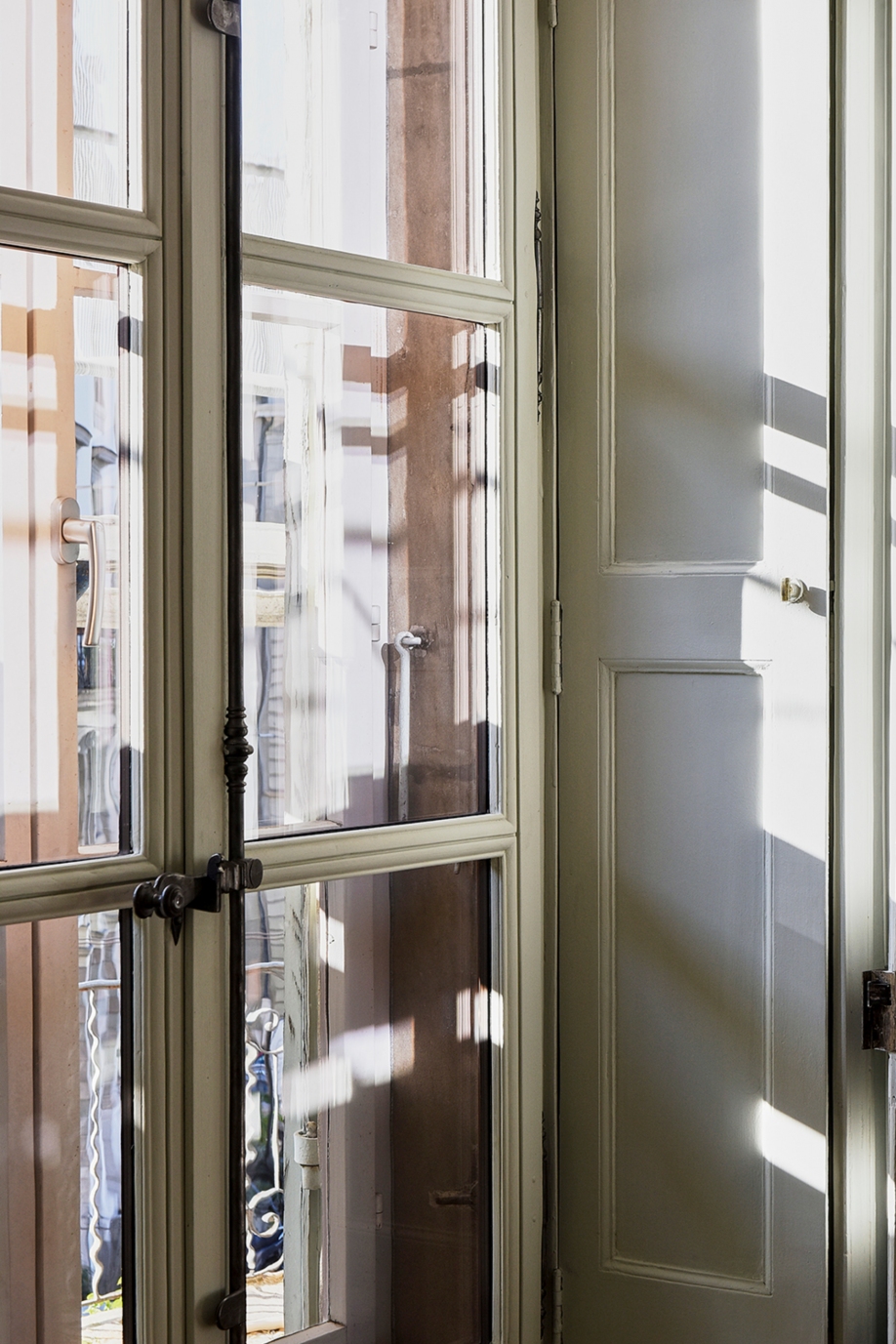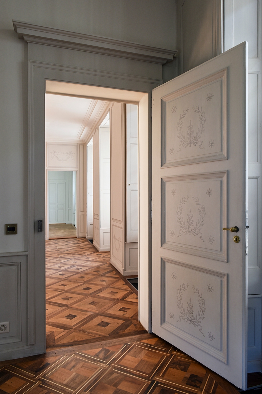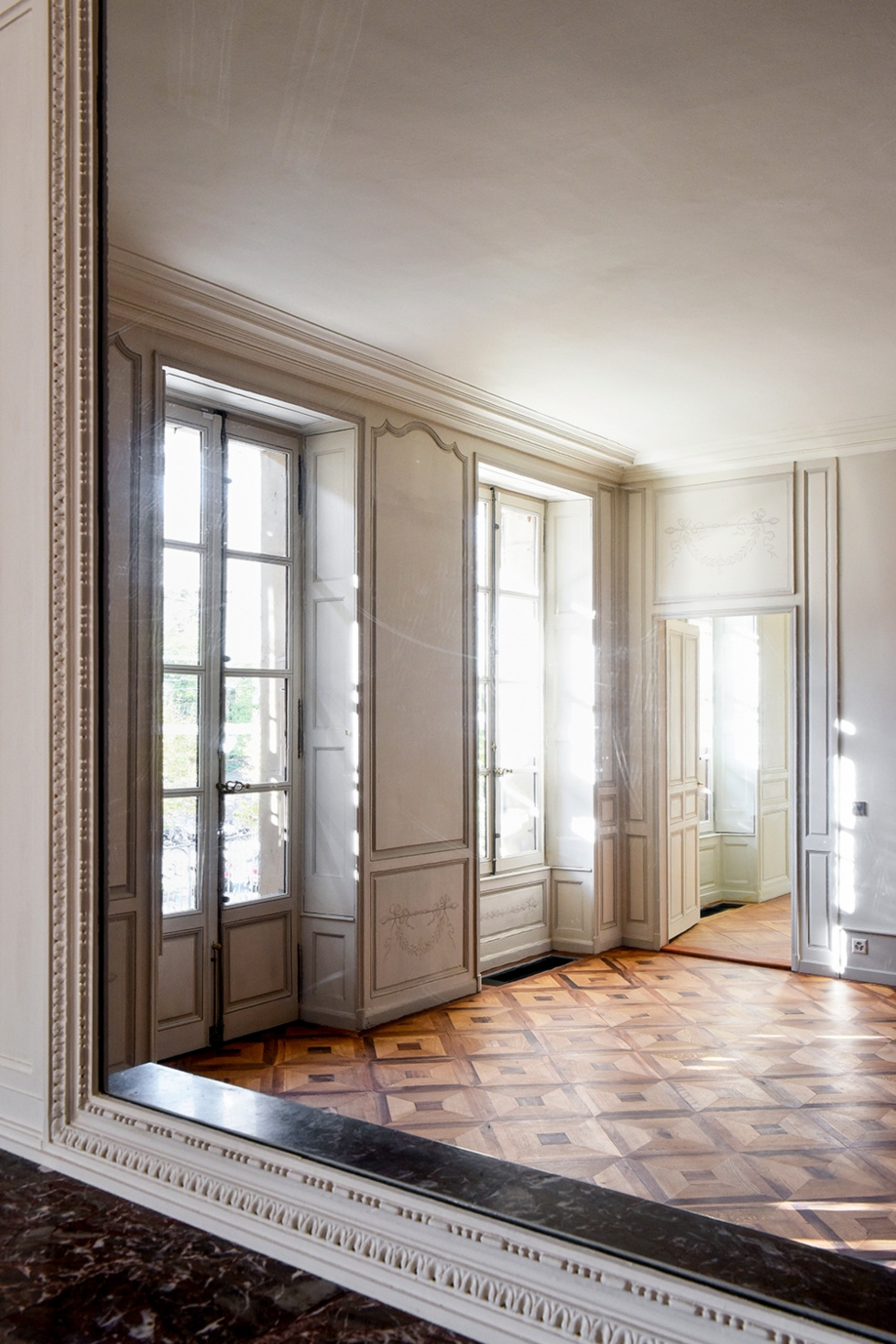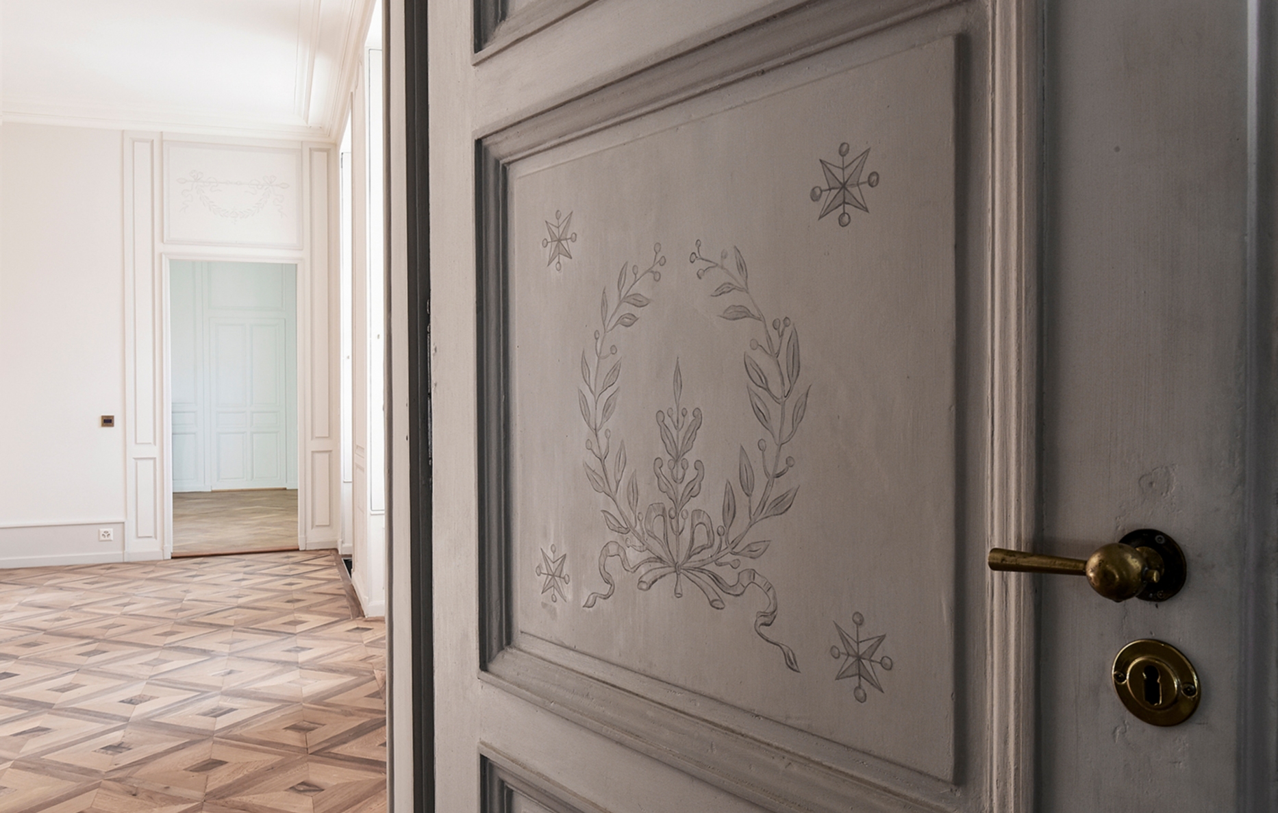 Révélés par des analyses fouillées, les nombreux éléments de décors anciens participent évidemment de la qualité et du standing des espaces intérieurs. Bien que la datation précise demeure parfois hasardeuse, il apparaît que nombre de boiseries, de miroirs ou de corniches moulurées présentent un intérêt patrimonial dont la remise en valeur s’impose comme une évidence. L’attestation incontestable d’un ornement peint ou sculpté conduit ainsi à des travaux de restauration soignée ou de reconstitution à l’identique ; tandis que la moindre incertitude liée à un décor potentiel impose une retenue totale, refusant toute interprétation douteuse. Sous le pinceau, la spatule ou la brosse des spécialistes, les motifs géométriques et figuratifs –cannelures, guirlandes végétales, couronnes de laurier, têtes d’animaux– reviennent à la vie sans dissimuler leur âge. La patine du temps est en effet valorisée par des interventions mesurées qui évitent le piège d’une cure de jouvence trop pimpante, inadaptée au cachet historique qui singularise l’endroit. Ce méticuleux travail de décapage dévoile un chromatisme insoupçonné, utile pour arrêter les choix de teintes et de textures qui vont habiller l’ensemble des pièces. Le bleu intense redécouvert sur le trumeau d’une cheminée et les touches de vert tendre de certaines boiseries ouvragées se posent alors en référence. Déclinées avec une délicatesse raffinée après d’innombrables essais, ces deux couleurs apportent une cohérence discrète aux différents espaces à vivre pourtant cloisonnés. Le recours à des peintures naturelles offre par ailleurs un toucher doux et agréable, loin des sensations produites par les surfaces synthétiques.