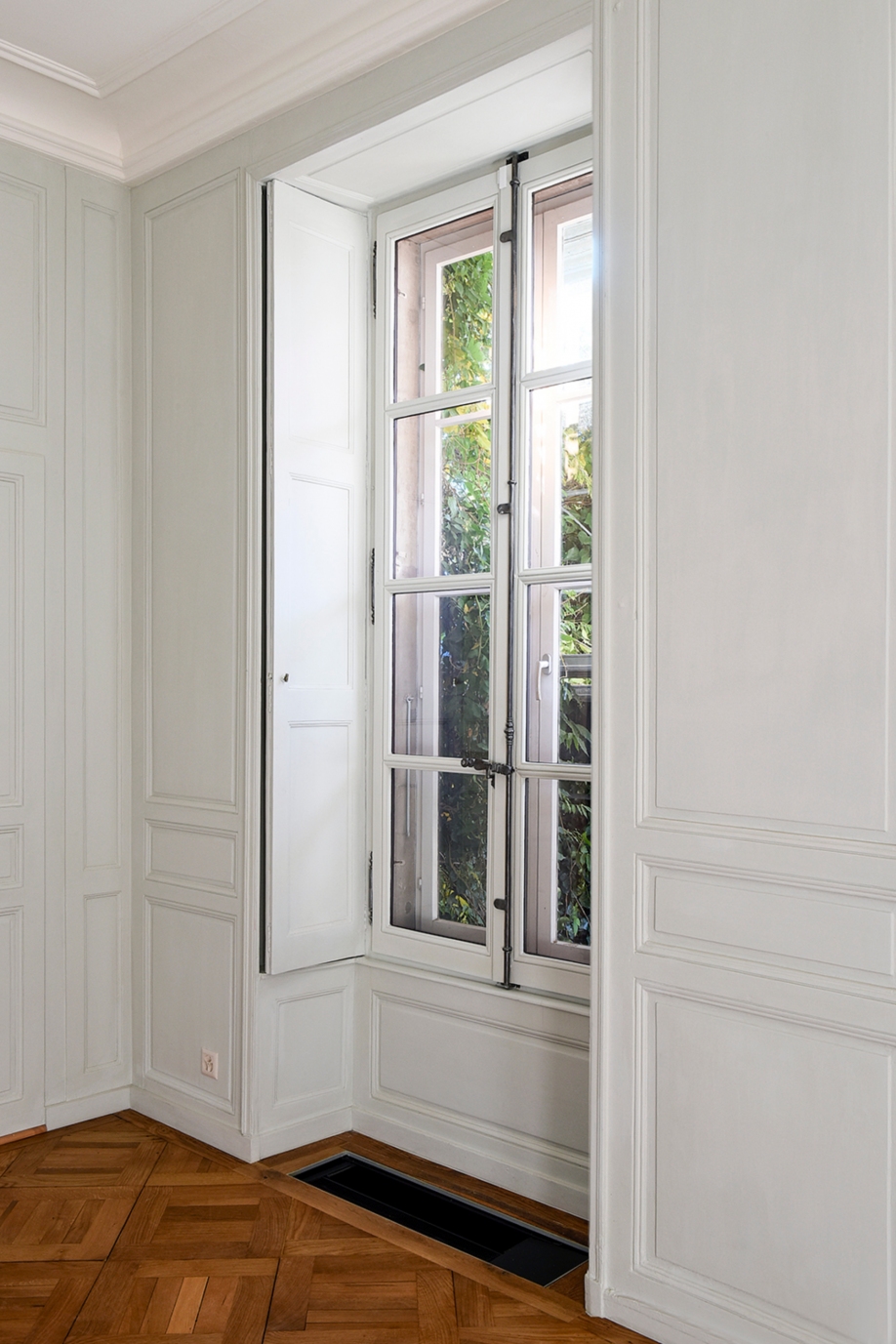 La modernisation complète des installations techniques s’est faite sans rompre la cohérence générale qui caractérise cet appartement. Une exécution discrète qui cache en réalité un lourd travail de repérage, de démontage et de remontage, pour aboutir à un agencement parfaitement ajusté à la substance patrimoniale en place. C’est le cas en particulier à l’étage supérieur avec la suppression des radiateurs posés à la fin du 19e siècle, désormais remplacés par des ventilo-convecteurs insérés dans la géométrie des embrasures et affleurés au niveau du sol. Enlevées une à une pour permettre le passage des gaines remontant depuis le sous-sol, chacune des lames de parquet a ainsi été reposée à son emplacement initial, comme autant de pièces uniques d’un immense puzzle de bois. À l’étage inférieur, les interventions ont libéré les plafonds des câbles et tuyaux installés année après année dans une fâcheuse confusion. Avec des éléments techniques ramenés au sol et centralisés, les voûtes retrouvent enfin leur forme pure, encore flattée par la mise en place avisée de quelques points d’éclairage. Sur l’ensemble de l’appartement, un assainissement général des belles menuiseries anciennes apporte par ailleurs une remarquable amélioration thermique, conforme aux normes en vigueur.