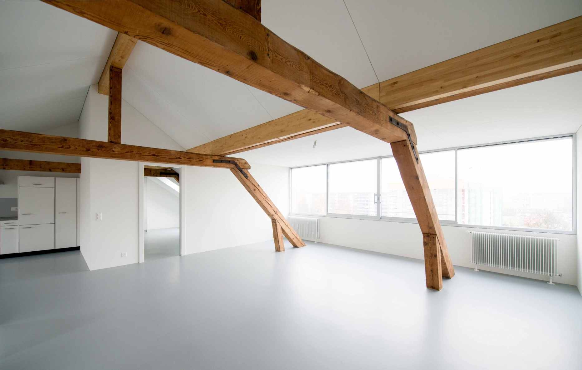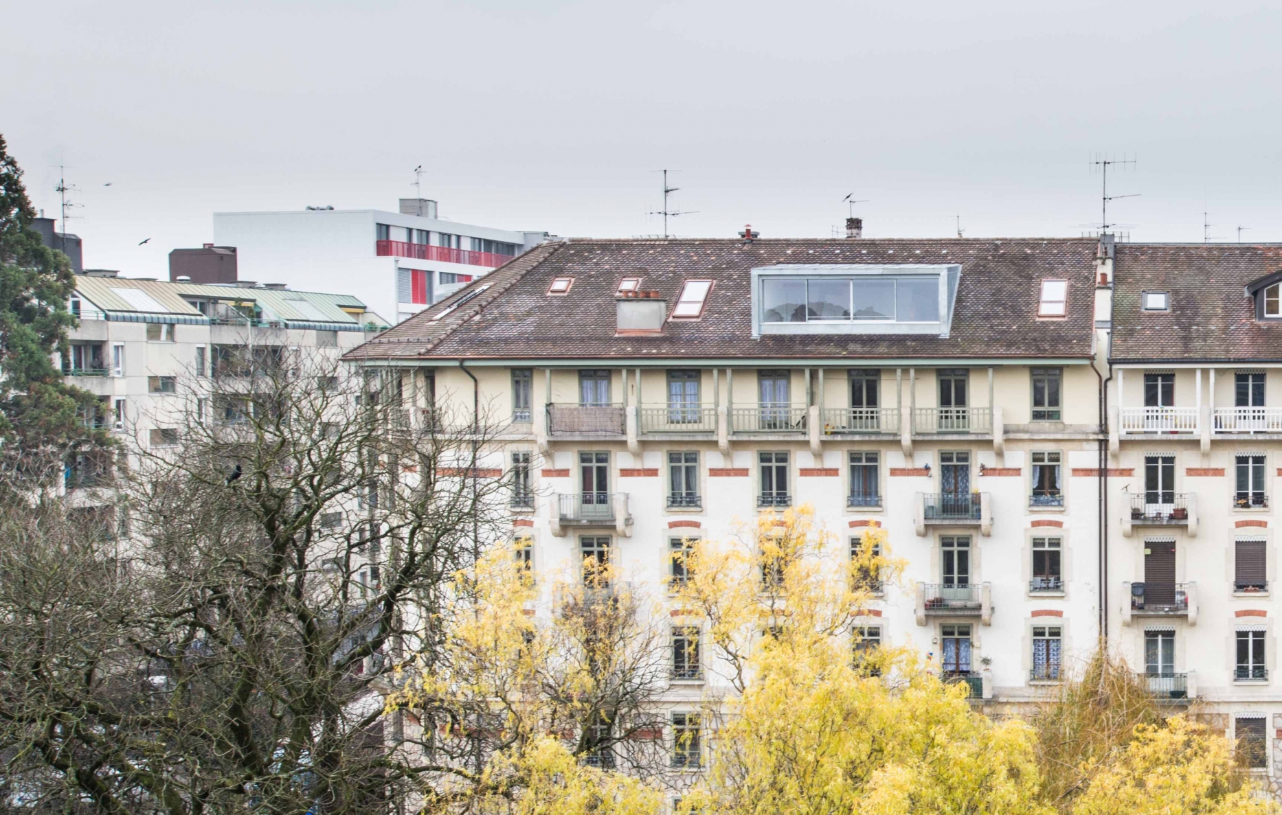 Cet état laisse sous la toiture un volume intéressant, occupé par une buanderie, une machinerie d’ascenseur et des locaux de débarras réservés aux locataires. Dès lors que ces derniers bénéficient aussi de caves, c’est un joli potentiel qui se révèle. Aux inconvénients concrets (morphologie de toiture compliquée, faiblesse statique de la charpente) s’opposent les avantages d’une situation en hauteur, où le charme des greniers se combine avec la possibilité de grands dégagements visuels sur les toits voisins, les montagnes et le ciel. En phase avec l’histoire de l’immeuble, les conditions du mandat s’imposent avec évidence : une exploitation respectueuse de l’espace pour la création d’appartements locatifs. Les diverses études de faisabilité délimitent les surfaces légalement habitables, repèrent les accès et examinent les besoins techniques. Surtout, elles définissent des concepts simples, éventuellement adaptables au dernier immeuble de l’ensemble encore sans combles aménagés. La planification pointue intègre les exigences d’un confinement pour désamiantage et, plus généralement, veille à la bonne marche d’un chantier conduit dans un immeuble habité.