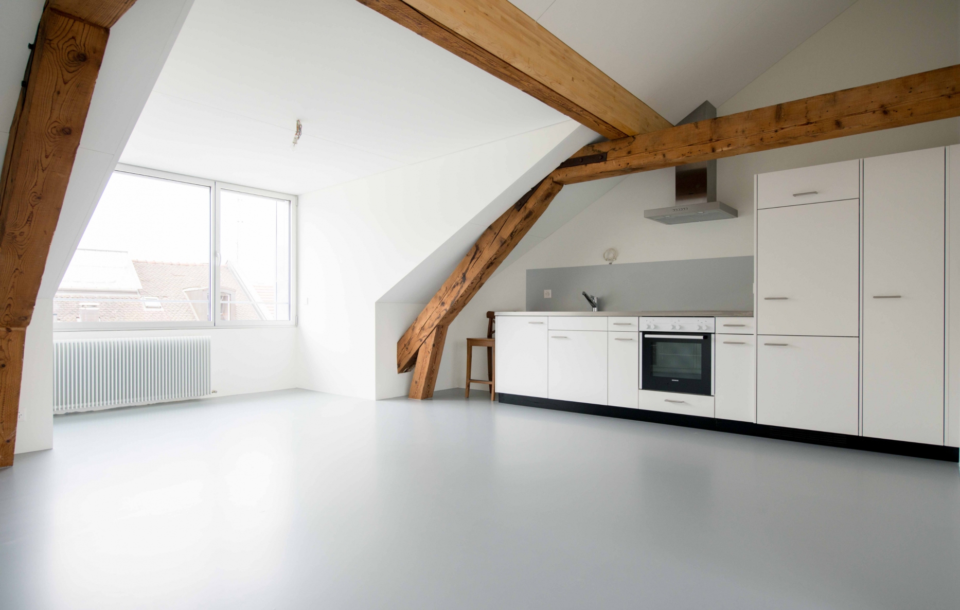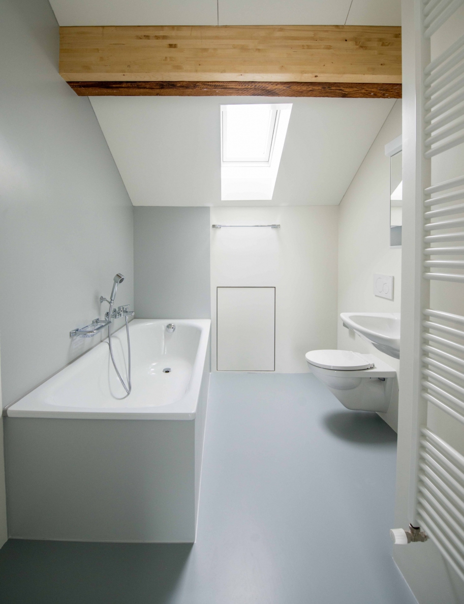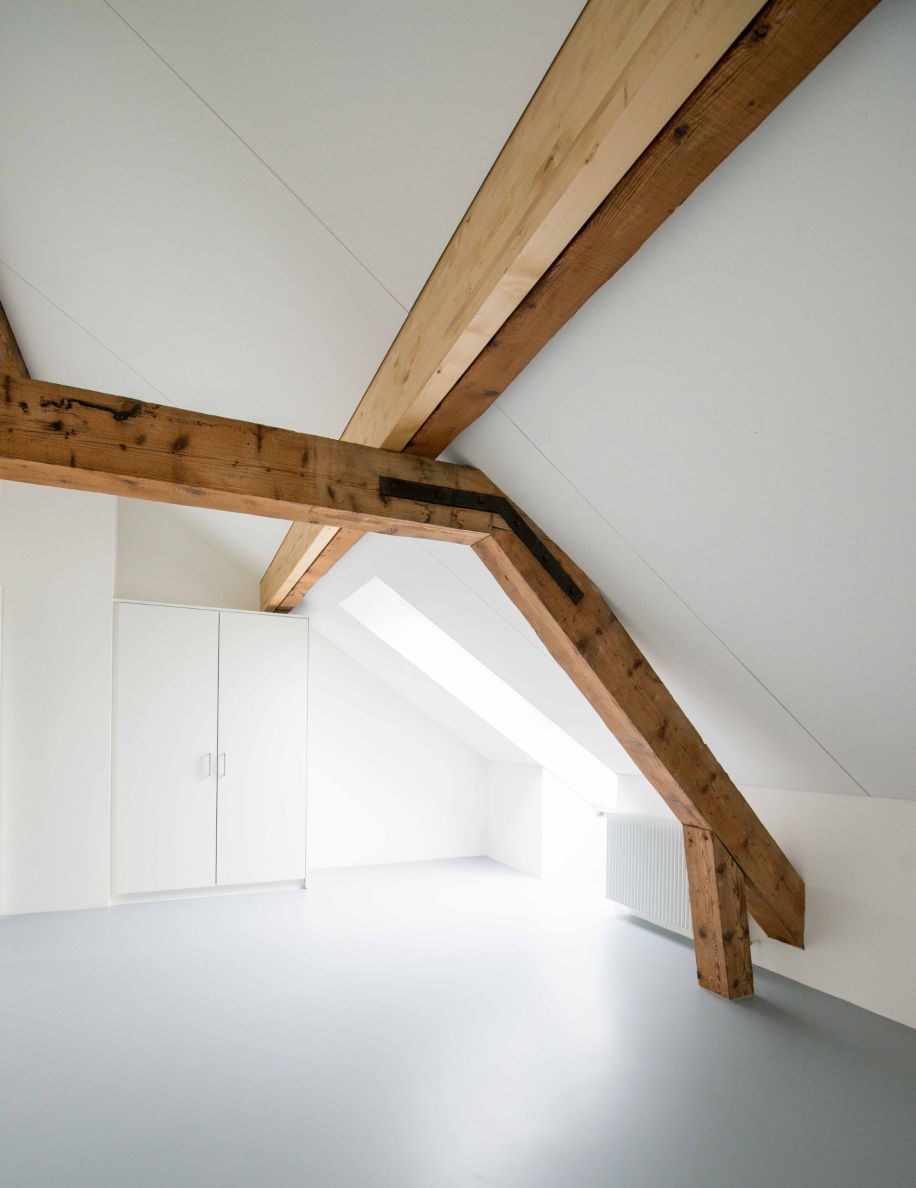 Le projet propose deux appartements de trois et quatre pièces. L’agencement profite de la situation existante (courettes techniques ou escalier d’accès) et offre des distributions fluides pour un apport maximal de lumière. Trois grandes lucarnes –deux sur la rue, une sur la cour– éclairent généreusement les espaces à vivre, alors que des châssis inclinés amènent un jour naturel jusqu’au plus profond des chambres et des salles d’eau. Tout est dimensionné selon la surface utile disponible et calibré en fonction de la structure de charpente qui, maintenue dans son état d’origine, se voit simplement renforcée par des pièces neuves ponctuelles. Grâce à la valorisation de la substance ancienne, l’habitabilité confortable créée ex materia ne perturbe pas la lecture d’origine des espaces. L’esprit du lieu est respecté par des finitions audacieuses, en adéquation avec l’affectation première. Une ambiance de grenier ou d’atelier présente dans toutes les pièces, assumée par une chape au sol peinte en gris ou des cuisines et des sanitaires traités avec une grande sobriété, le tout évidemment mis en place avec soin et d’une esthétique résolument moderne. Une contemporanéité confirmée à l’extérieur, où les lucarnes se parent de zinc titane, en contraste avec les ferblanteries de cuivre d’un toit désormais isolé.