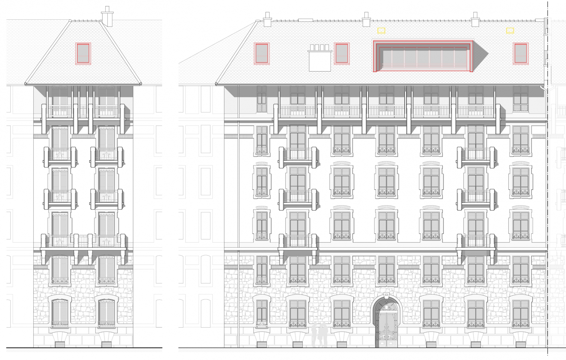 Étape importante dans l’existence de l’immeuble, cet aménagement de combles ne s’inscrit pas comme une rupture. Comme autant de réponses données aux ambitions du programme et aux contraintes de l’existant, les options claires et franches du projet ont été dictées par la compréhension fine des lieux. Le regard s’est voulu à la fois humble et lucide, au service des habitants et d’une architecture aujourd’hui plus que centenaire.