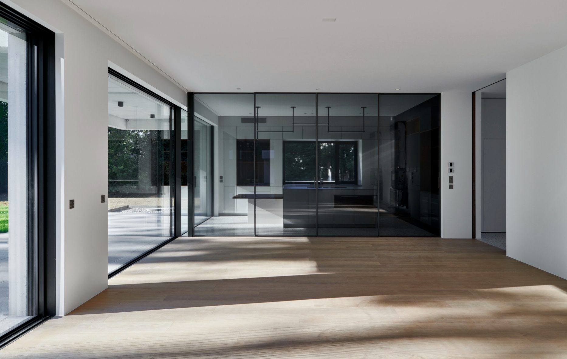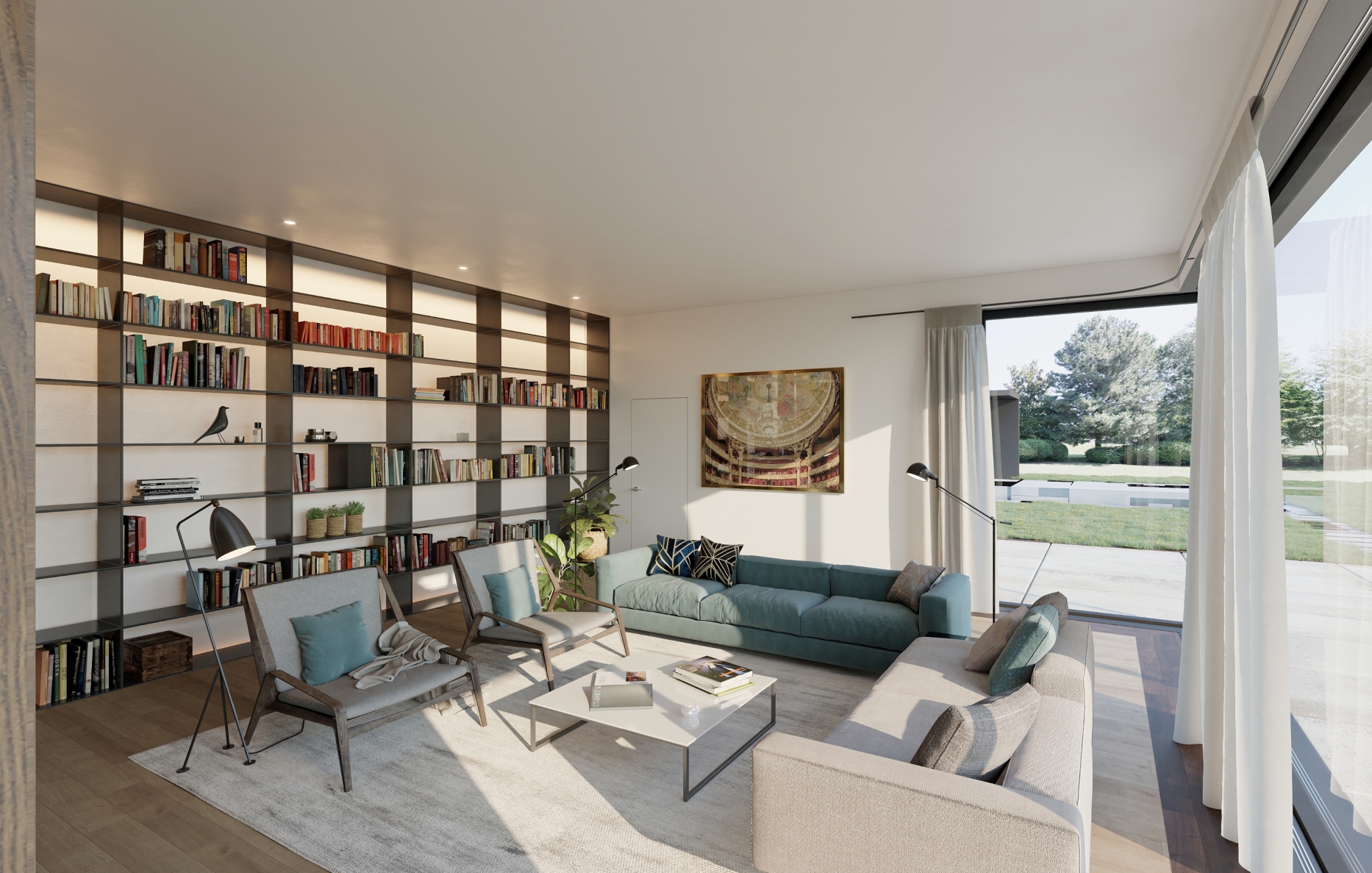 C'est là un projet ancré sur une parcelle de près de 12'000 m2 et qui, d'un point de vue historique, vient trouver sa place sur l'un de ces fameux grands domaines genevois qui parsèment la réalité géographique du canton. Le terrain qui nous occupe couvre environ 4'000 m2, encadré au loin par des maisons de maîtres et quelques dépendances à usage rural, la villa prend place dans un parc ouvert, dont les limites parcellaires sont quasiment invisibles à l'œil nu.