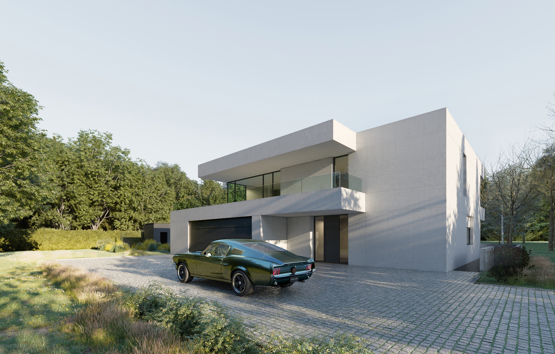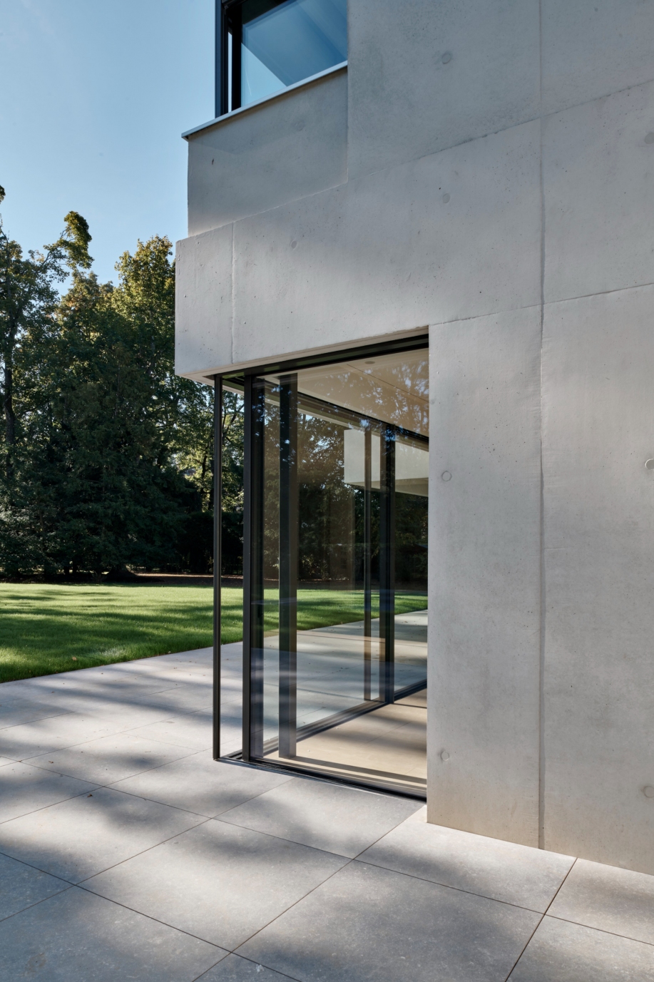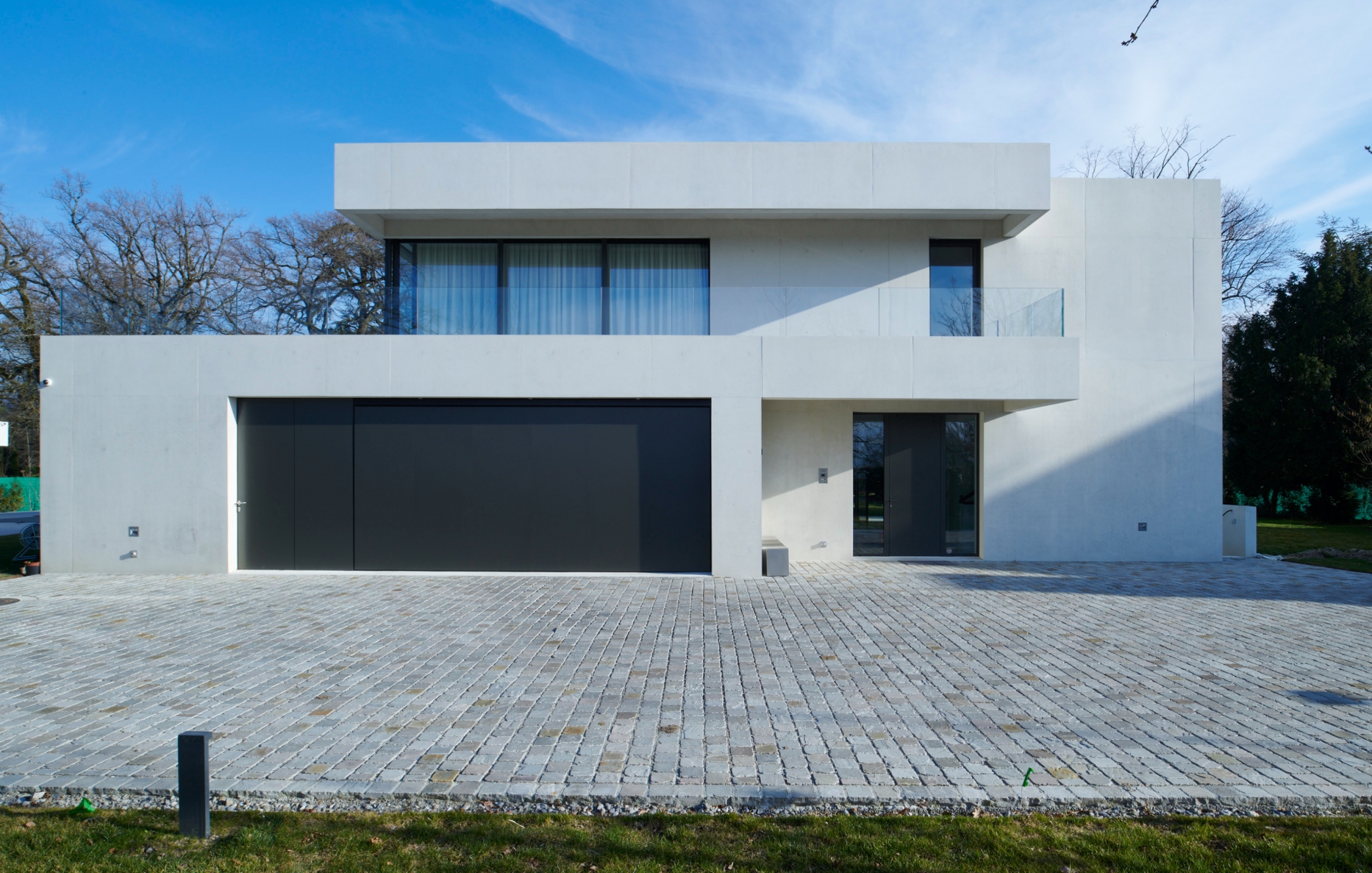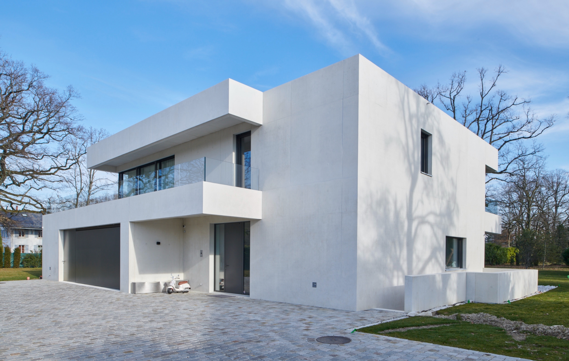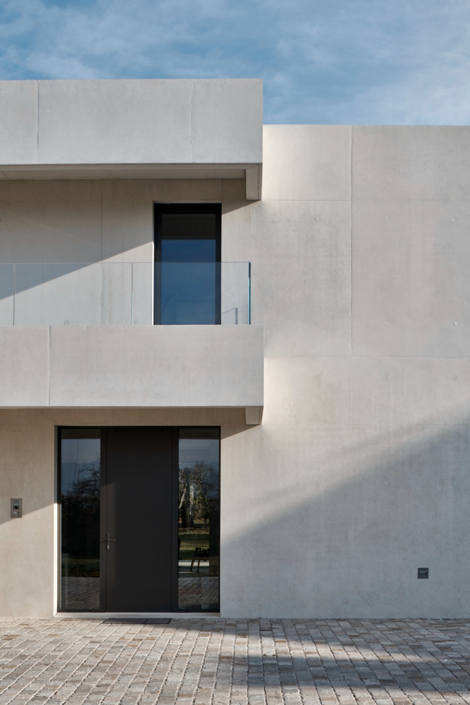 Le programme consiste en une villa familiale. On y trouve une grande zone de jour, deux chambres avec salles de bain, une suite parentale... Le bâtiment est monolithique, tout de béton apparent, avec une isolation par l'intérieur. Un béton porteur pour une expression minérale qui fait écho à la parcelle. Avec ses décrochements, si l'on regarde sa façade sud-est, les différents éléments ont été aménagés avec une évidente esthétique plastique. Ils servent ici de balcon, là de protection contre les intempéries pour la terrasse et l'entrée. Même si l'approche constructive est résolument contemporaine dans sa définition, elle est volontairement traitée avec discrétion et une certaine humilité, ceci afin que la maison de maître au loin reste prédominante, que ce soit en termes d'importance, d'histoire ou de localisation.