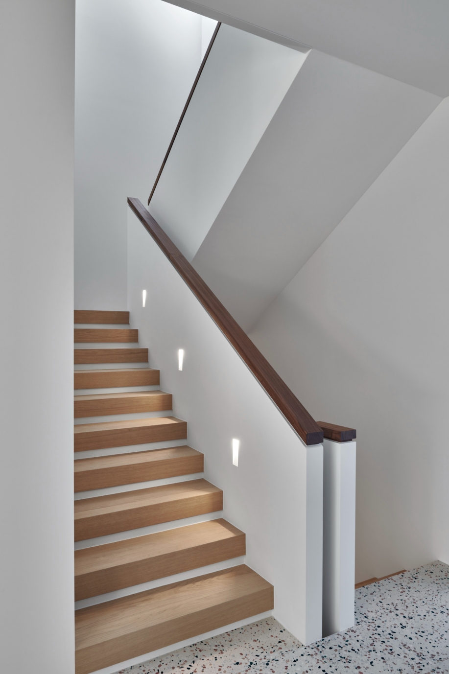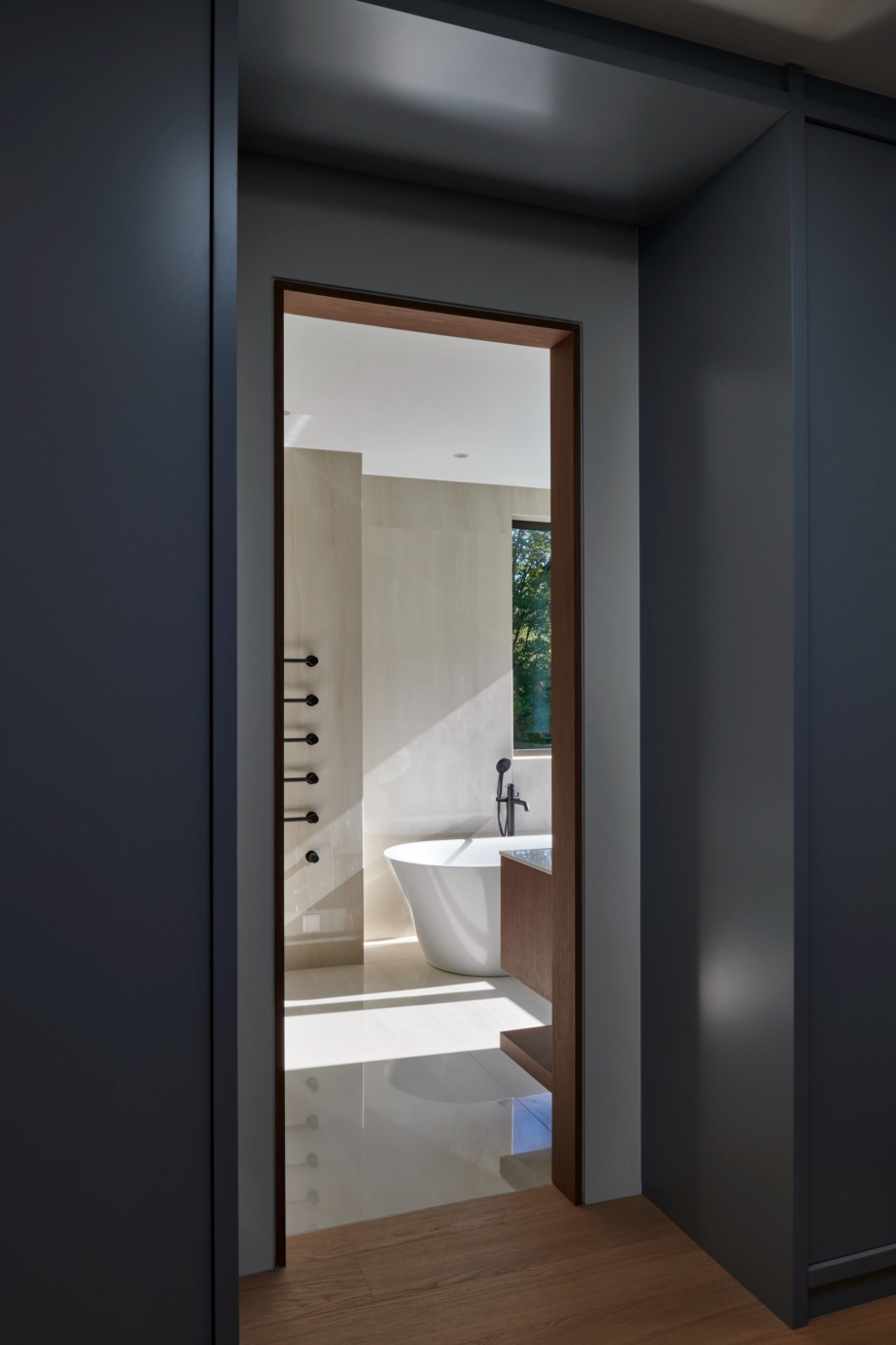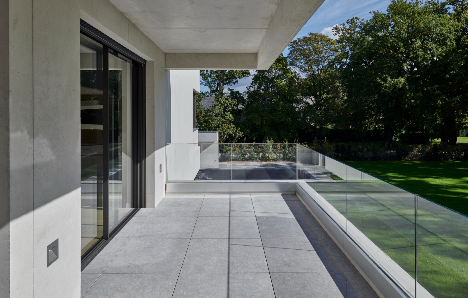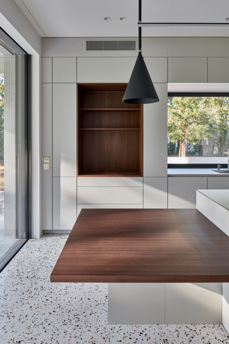 Le pourtour de la villa est recouvert d'une terrasse minéralisée. On retrouve le même encadrement autour de la piscine qui vient se nicher dans le coin le plus ensoleillé de la propriété. Les deux zones sont reliées par une succession de dalles qui, visuellement, agissent comme une série de traitillés graphiques. Le pool-house, minimaliste, est comme une extension de la terrasse qu'on aurait dépliée jusqu'à son emplacement idéalisé.