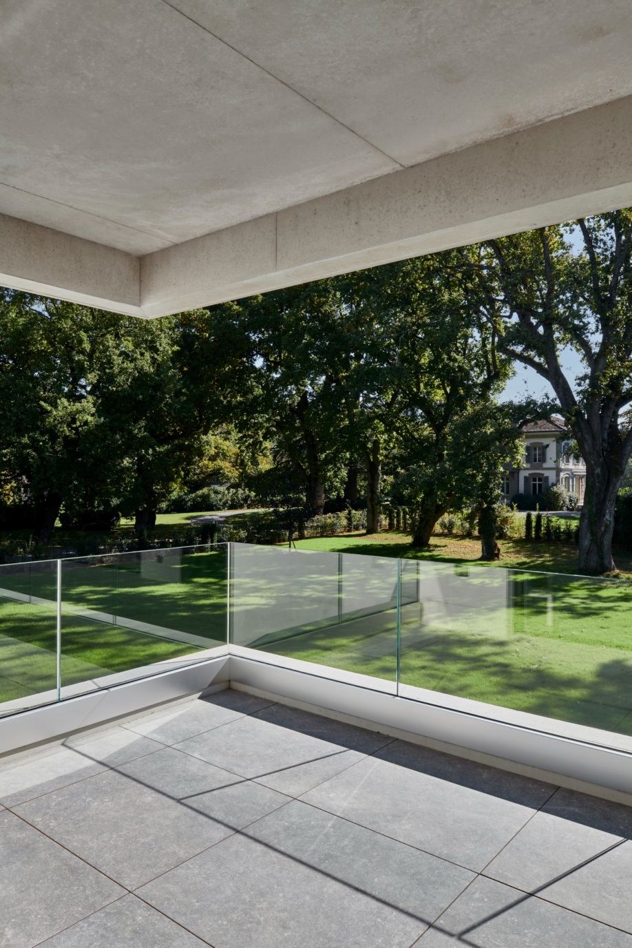 Afin de rentrer dans la logique du domaine (et d'en préserver au mieux les intérêts), l'implantation s'est faite en bordure de celui-ci, selon les usages habituels. Afin de ne pas s'éparpiller sur la parcelle, l'allée d'arbres centenaires a été préservée, les poches de verdure respectées. Le respect de l'empreinte arboricole de l'ensemble revêtait une importance notable dans le dispositif à imaginer. Un golf se situe non loin, terrain de greens et de bunkers dont la topographie préserve à long terme la vue sur le Léman.